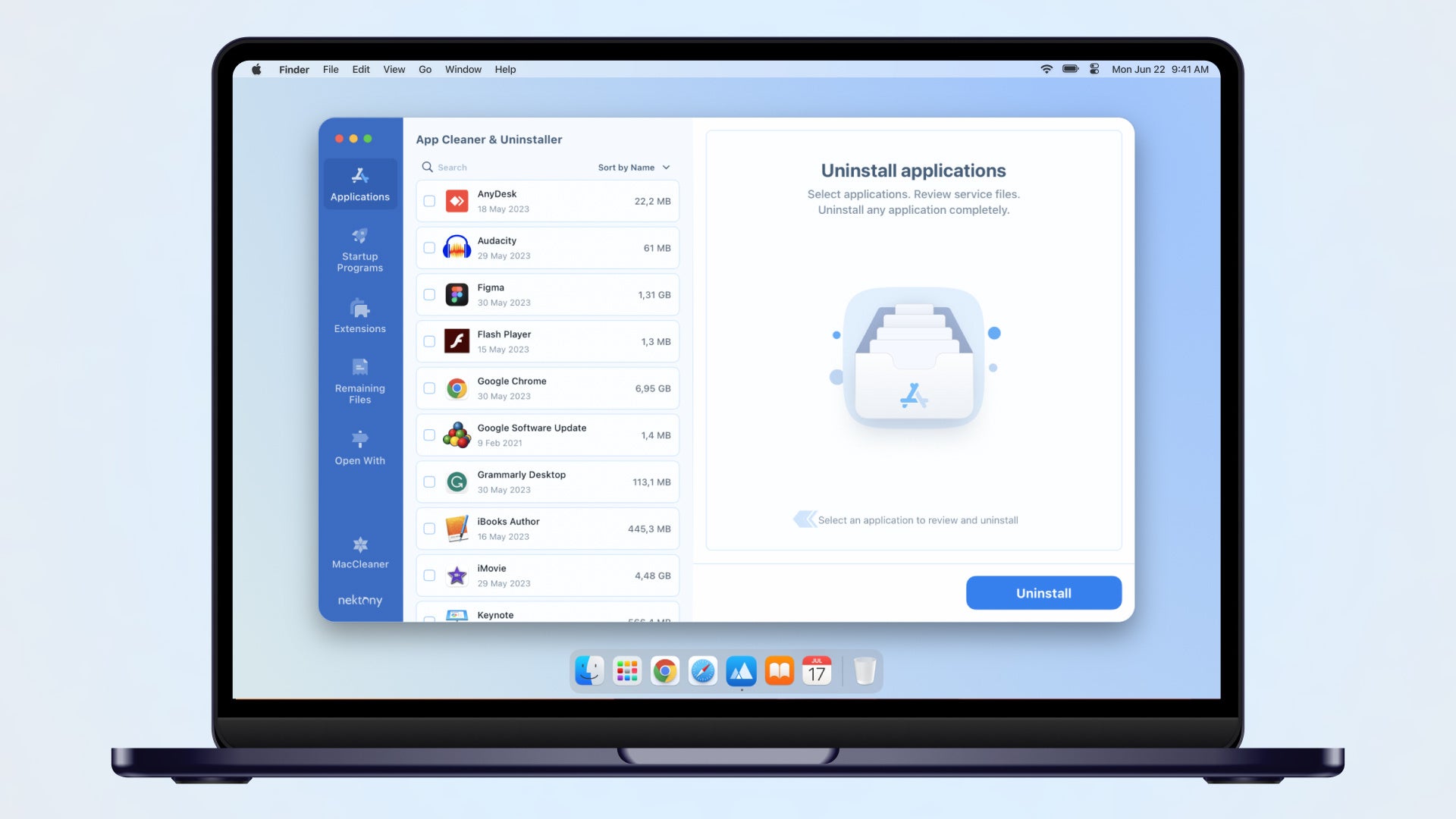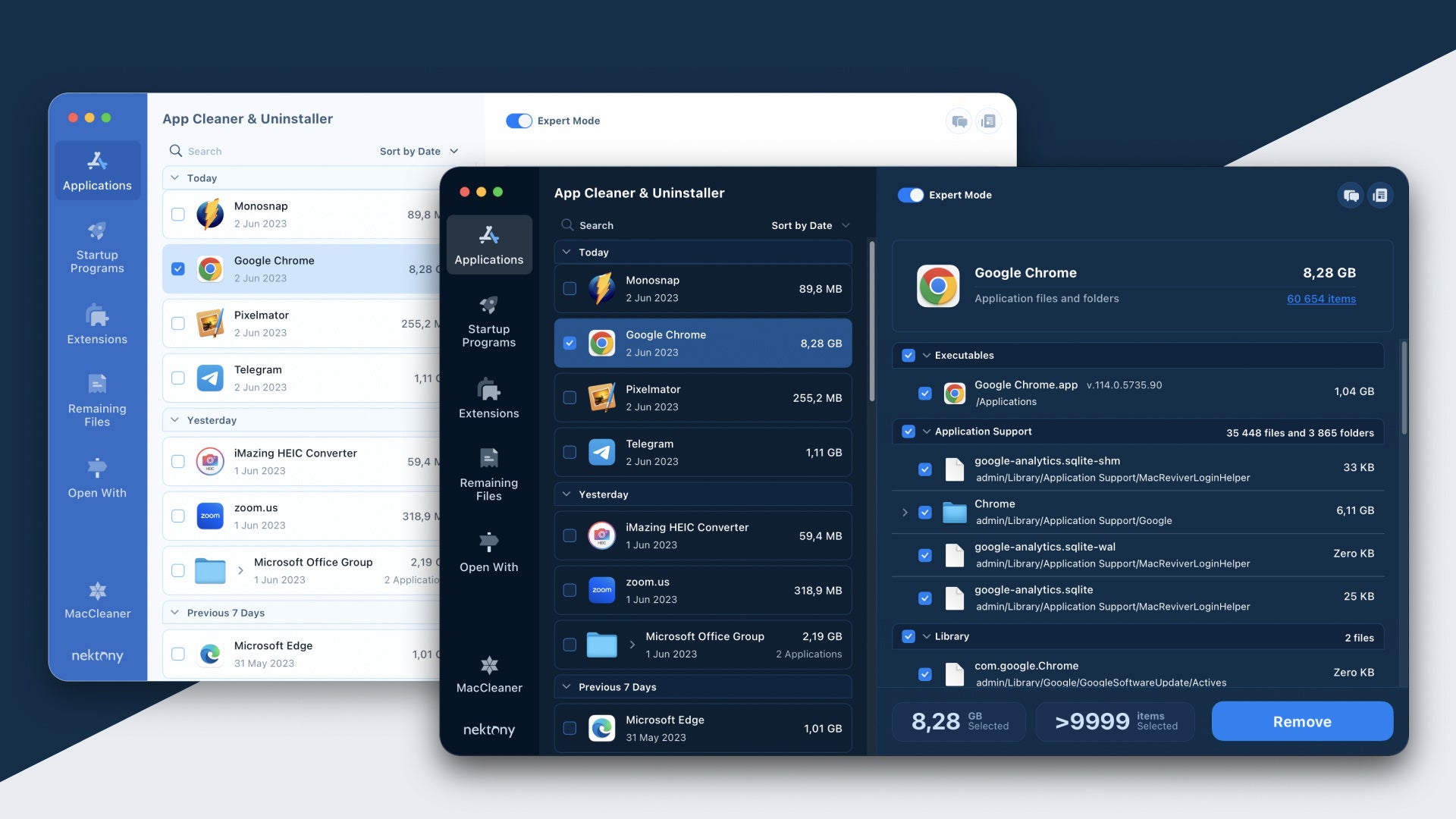 App Cleaner & Uninstallerは2015年に発売され、削除されたアプリのすべての痕跡を徹底的に削除するというコンセプトを先駆けとしています。この機能はMacユーザーから広く称賛されています。このアプリのシンプルでエレガントなデザインにより、アプリのサイズ、残されたファイル、拡張子の数、およびディスクスペースの節約の可能性についての明確な概要を提供し、ナビゲーションと理解が容易です。