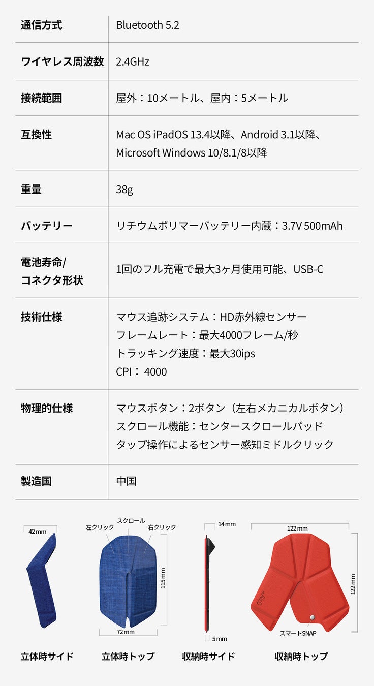 これまでになかった”マウスを折りたたむ”という概念で、持ち運び時は平面状態にすることで存在感を感じさせないほどコンパクトになり、使用したい時は内蔵マグネットにより指先の操作だけで瞬時に強固なフルサイズマウスになるので、旅先や出張などどこにいても常に最高の生産性を生み出します。