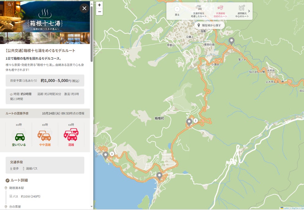 デジタル技術を活用した混雑状況の可視化を踏まえた観光ルート提案・クーポン発行などによる旅マエ・旅ナカの情報発信とスムーズな箱根周遊を促進する観光デジタルマップ。