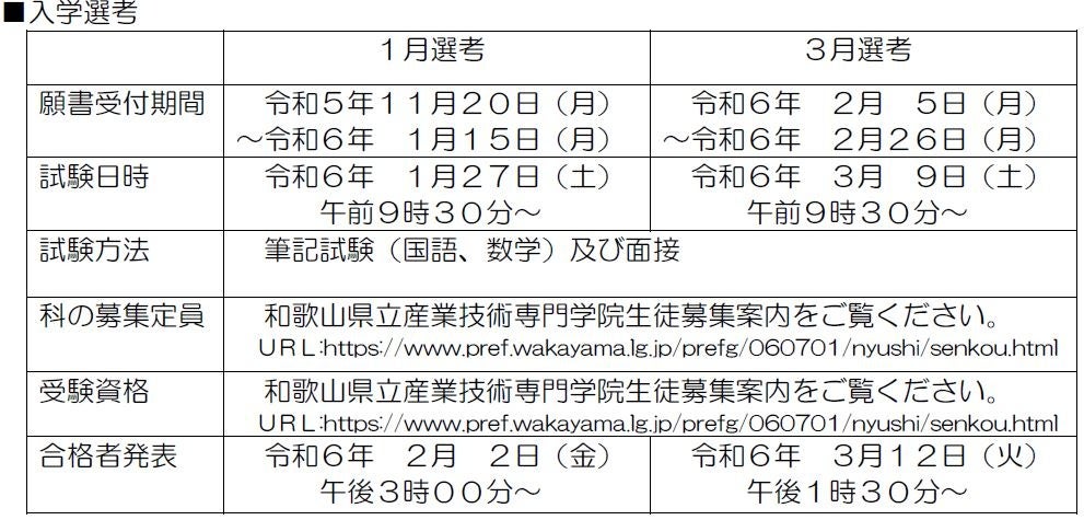 科の募集定員、受験資格について詳しいことは和歌山県立産業技術専門学院生徒募集案内をご覧ください。