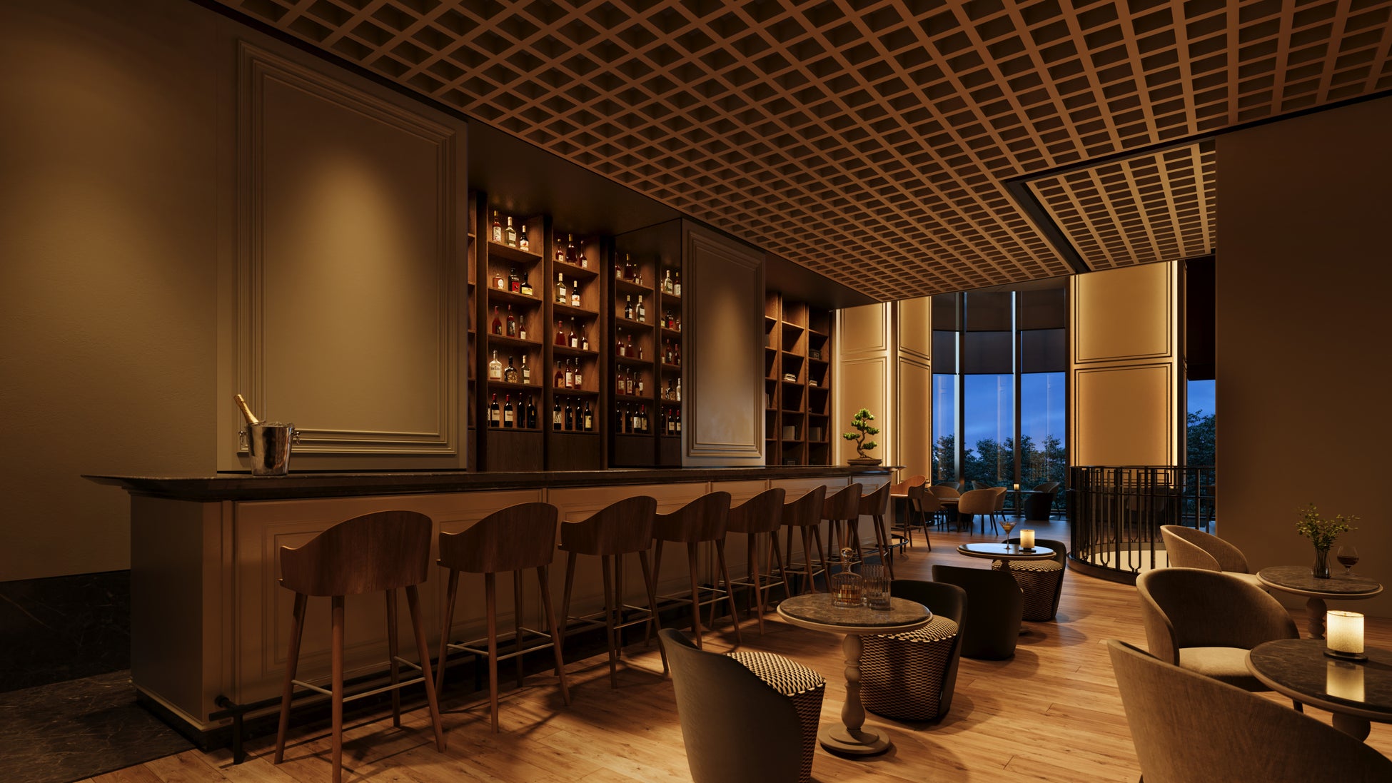 ジャヌ東京の世界観は、高い天井のギャラリーとレセプションから始まります。綿密に計算されたガラスのディテールと、ソフトに輝く光を反射する質感のある壁の装飾、高い天井が、広がりのある空間を演出します。天井には、繊細な格子の木工細工と、日本の伝統的なしめ縄の技法を現代風にアレンジした縄編みのアーチが装飾され、訪れたゲストを街中からジャヌの心髄に温かくお迎えします。数々のアマンのインテリアデザインを手がけ、多くの国際的アワードを受賞しているデニストン設計事務所のジャン=ミシェル・ギャシーは、「ジャヌ東京のDNAは、アマンの落ち着きと静穏さとは一線を画し、活気と遊び心に溢れた若々しいエネルギーに満ちています。この空間は、感覚とイマジネーションを刺激するテクスチャー、色彩、デザインのスリリングな探究です。」と、コメントしています。