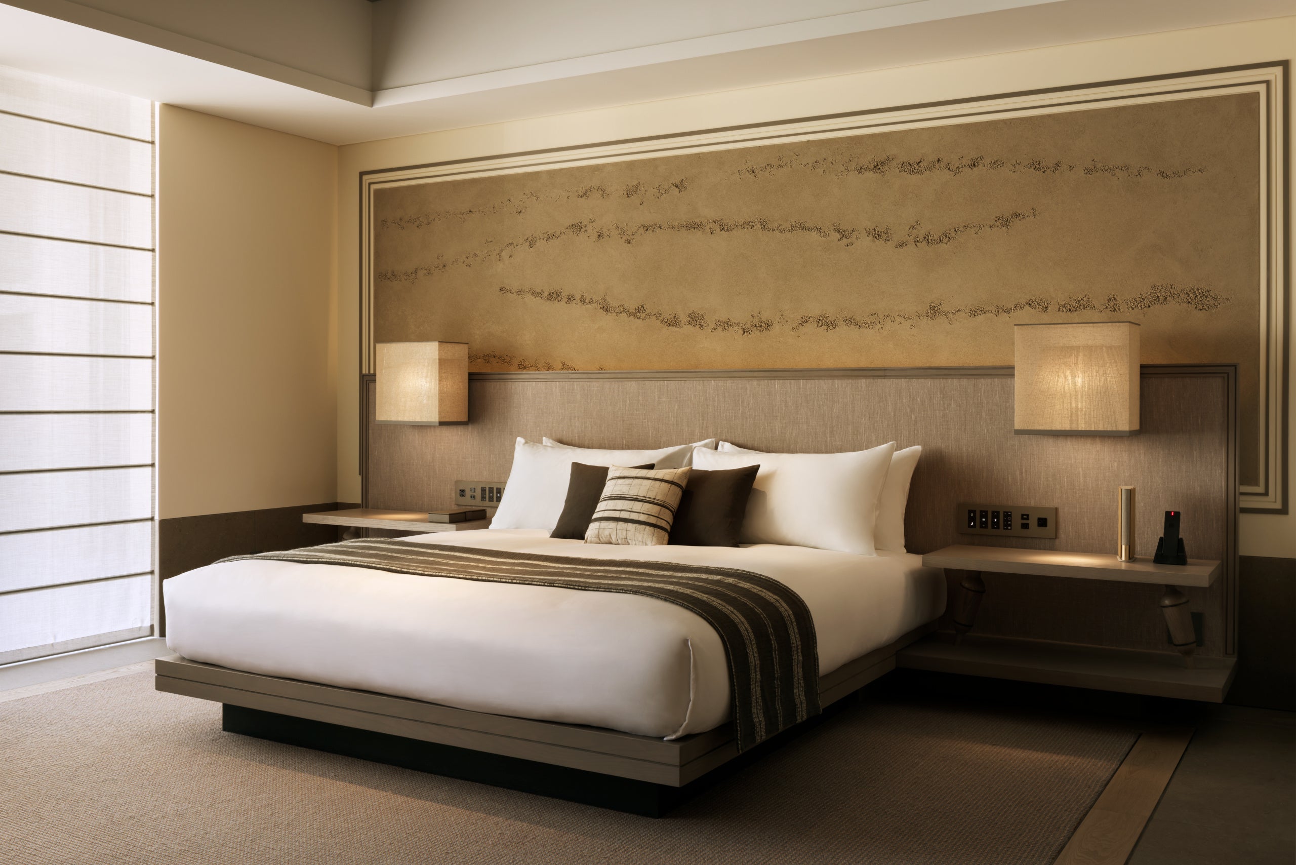 ジャヌ東京の6階から13階までのゲストルームとスイートは、広さ55㎡からご用意しており、タイムレスなアジアンテイストのインテリアに現代ヨーロッパの要素を加えたデザインに仕上げています。また、ミニマリズムとシンメトリーにフォーカスした空間は、リラクゼーションとエネルギーの調和を生み出します。多くの客室にはプライベートバルコニーがあり、都心のスカイラインや麻布台ヒルズ周辺の緑を眺める開放感、都市の鼓動をご満喫いただけ、「コーナースイート」と「タワービュースイート」の特徴的な窓からは、二面の眺望をお楽しみいただけます。また、多くの客室はコネクティングルームとなっており、グループやご家族でのご旅行に、シームレスなつながりを演出します。すべての客室には、ダブルシンクの洗面台、レインシャワー、特注のバスタブを備えた広々としたバスルームがあり、美しく光を通すスライド式の間仕切りの壁がベッドルームとの間にプライバシーをもたらします。便利なダブルクローゼットと、魅力的なリビングエリアも備わり、心地よい空間を楽しめます。