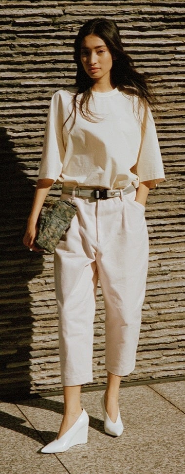 古くは17世紀を起源とするペインターパンツ定番の丈夫な生地、機能的なスリットポケット、可動性のためのボリューム感を踏襲。張りのある上質なキャンバス生地、ダーツやテーパードのディテール、そしてオーバーサイズ・シルエットのラインを崩さないクロップ丈を加えてエレガントなデザインに昇華させています。表地には繊細で洗練された天然由来の顔料や草木染めを施したキャンバス生地、ライナーには心地の良い高品質タイプライター生地を使い、ともに100%オーガニック綿でエシカルな贅沢さも持ち合わせています。悪天候でも活躍する防水性と透湿性に優れたリサイクルナイロンと植物性由来の原料を使用したAnthracite(チャコール)ナイロンモデルを含め、2素材/3色での展開。