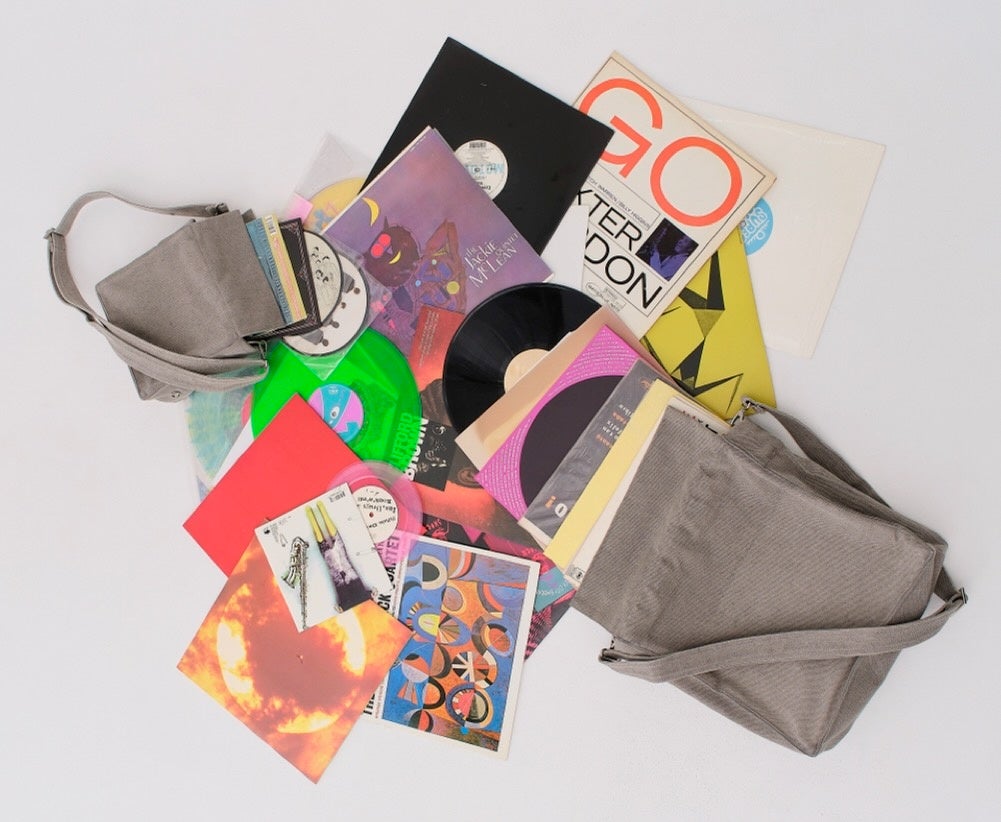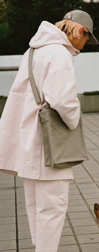 デジタル時代におけるアナログレコードのリバイバルに着想した、レコードバックをモチーフにしたデザイン。日本の折り紙や寄せ細工の手法を応用したスクエア・フォルムに、スマートフォン、タブレット、ドリンクボトル等も収容できる実用的なデイリーユース仕様が加えられています。上質なオーガニックコットン100%のキャンバス生地のみを折り畳んで重ねた構造で、石油由来の化学繊維や革製品にはない柔らかなシルエットと優しいテクスチャーが特徴。上質なコットン生地、天然由来の染色、そして高品質なメタルパーツが生み出すエシカルな贅沢さを味わえます。アナログレコードは10〜20枚程度収納できます。