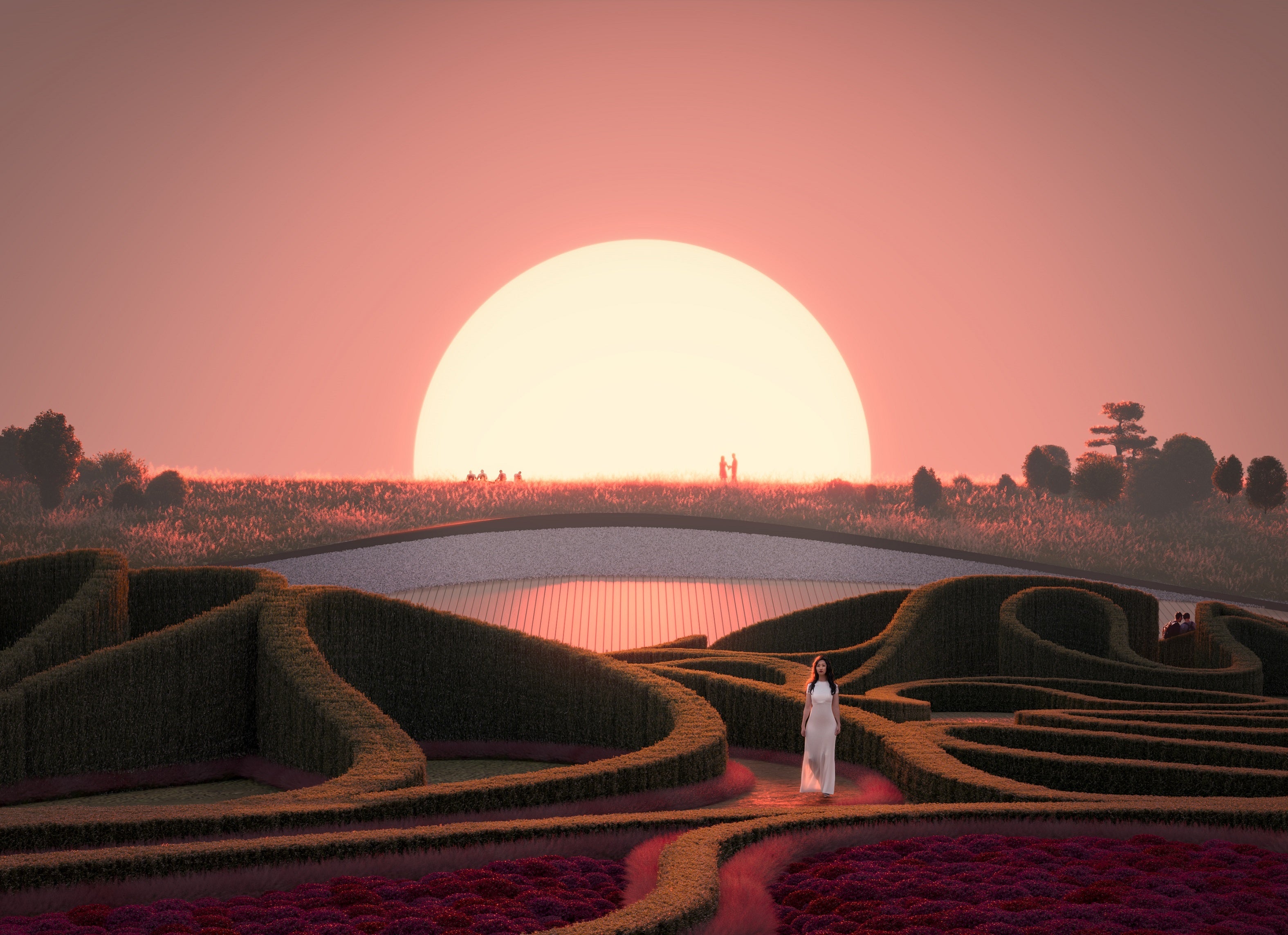 ピアッツァ(広場)テアトロ(劇場)ジャルディーノ(庭園)という社会空間にスポットライトを当て、イタリアの理想都市を三つの幕で構成しました。屋上部分に設けられるイタリアの庭園は、古典的な迷宮のアイデアを現代的にアレンジしたもので、博覧会会場の大屋根からも見ることが出来るものです。