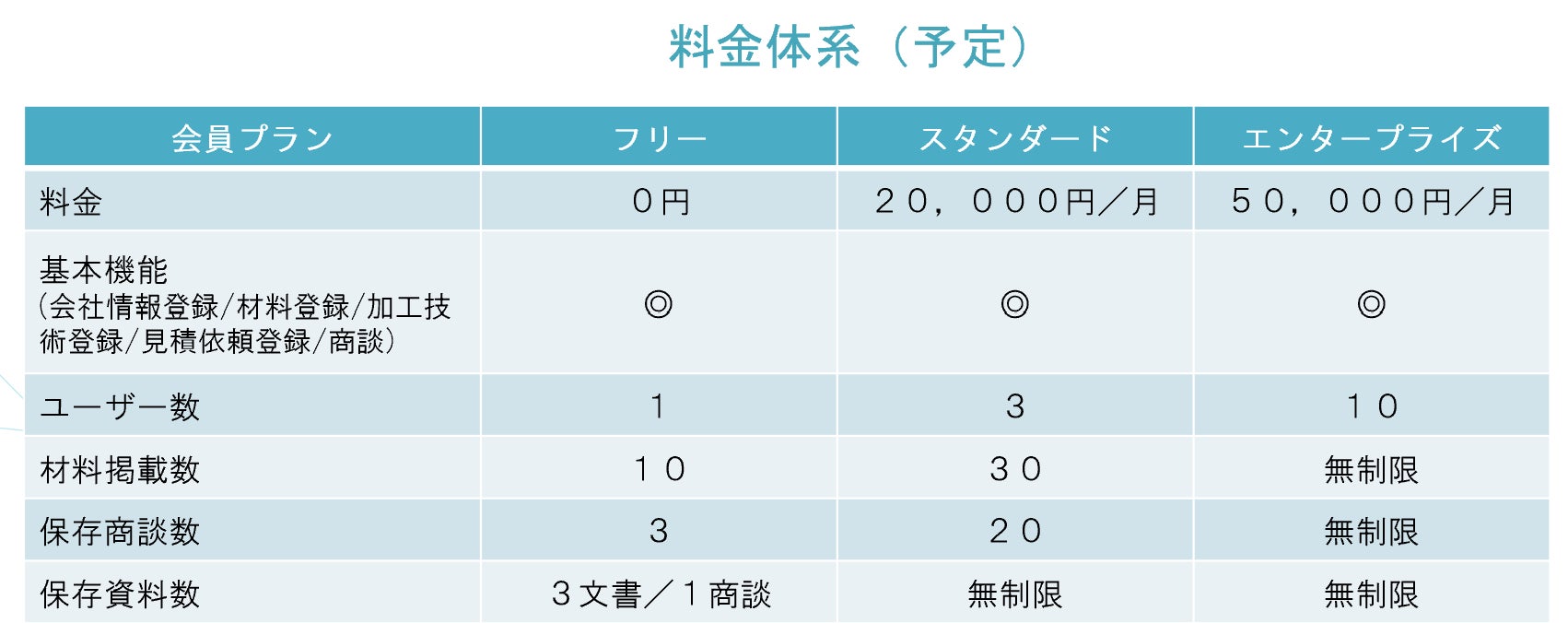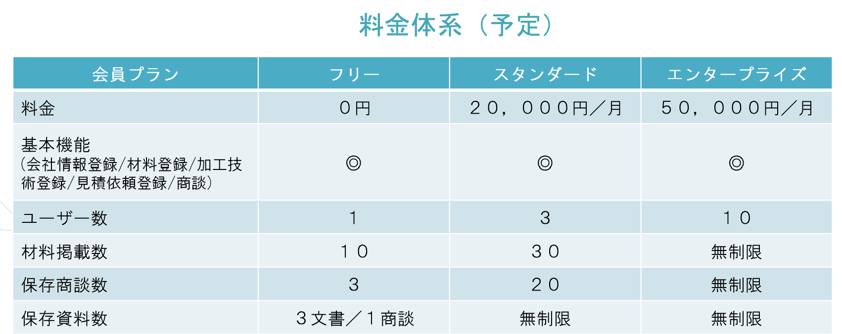 無料会員(フリー):ユーザ数、材料掲載数、商談の保存数、保存資料数に制限