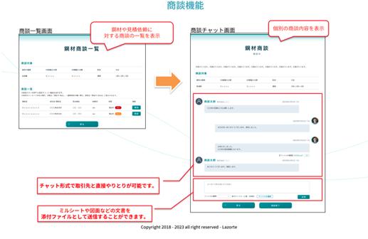 ②チャット形式の商談スペース上で商談や文書のやり取りを実現