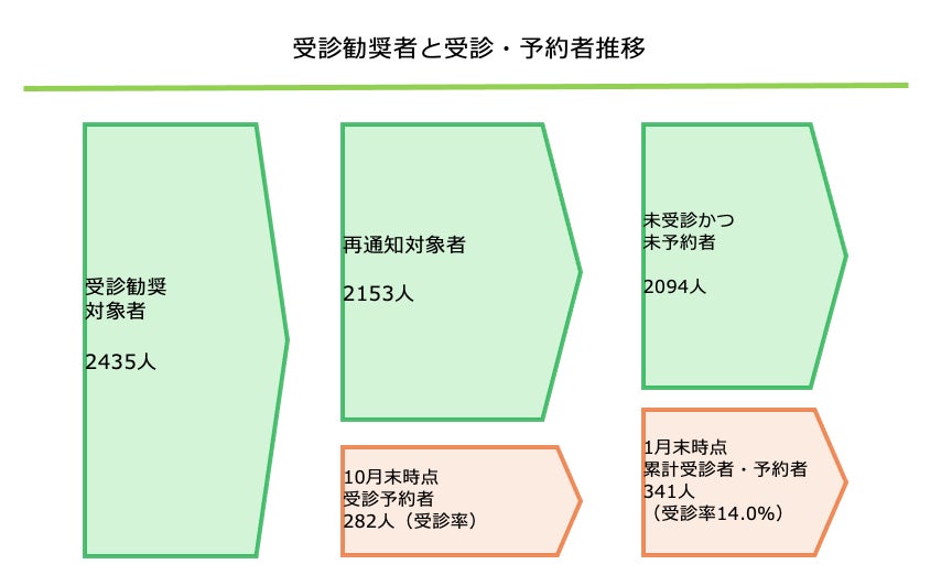 2023年8月から2024年1月までに、2,435人の未受診者に勧奨通知を郵送し、2024年1月末時点で331人が受診ならびに受診予約を行いました(受診率14.0%)。その結果として、乳がん・子宮頸がんの両方のがん検診対象者の受診率が前年度比約1.5倍に増加しました。