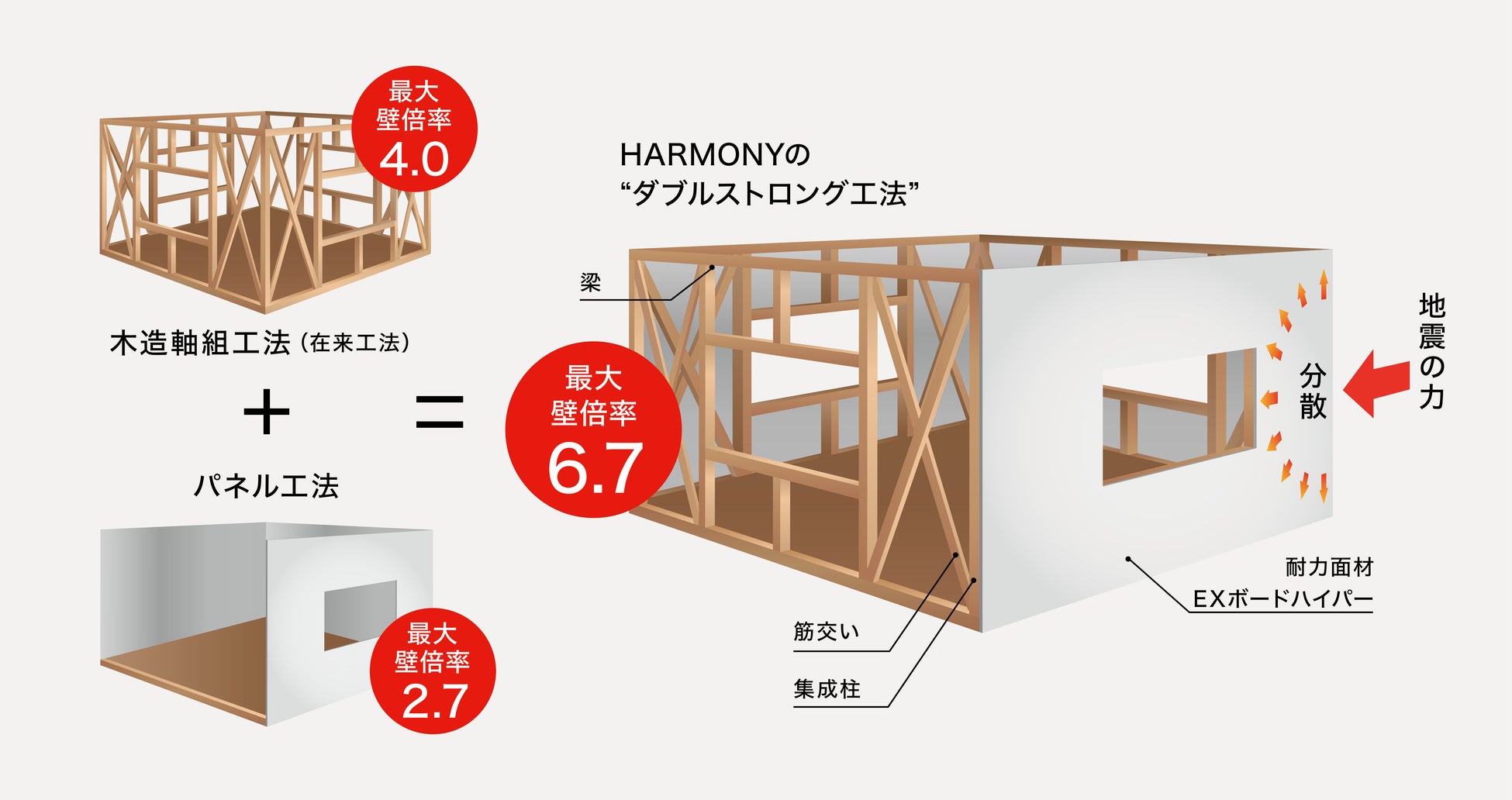 木造軸組工法に従来の筋交いを施すだけでなく、土台と柱、そして梁を一枚の体力面材で結合した「ダブルストロング工法」で地震の強い力を分散し、より優れた耐震性を実現しました。