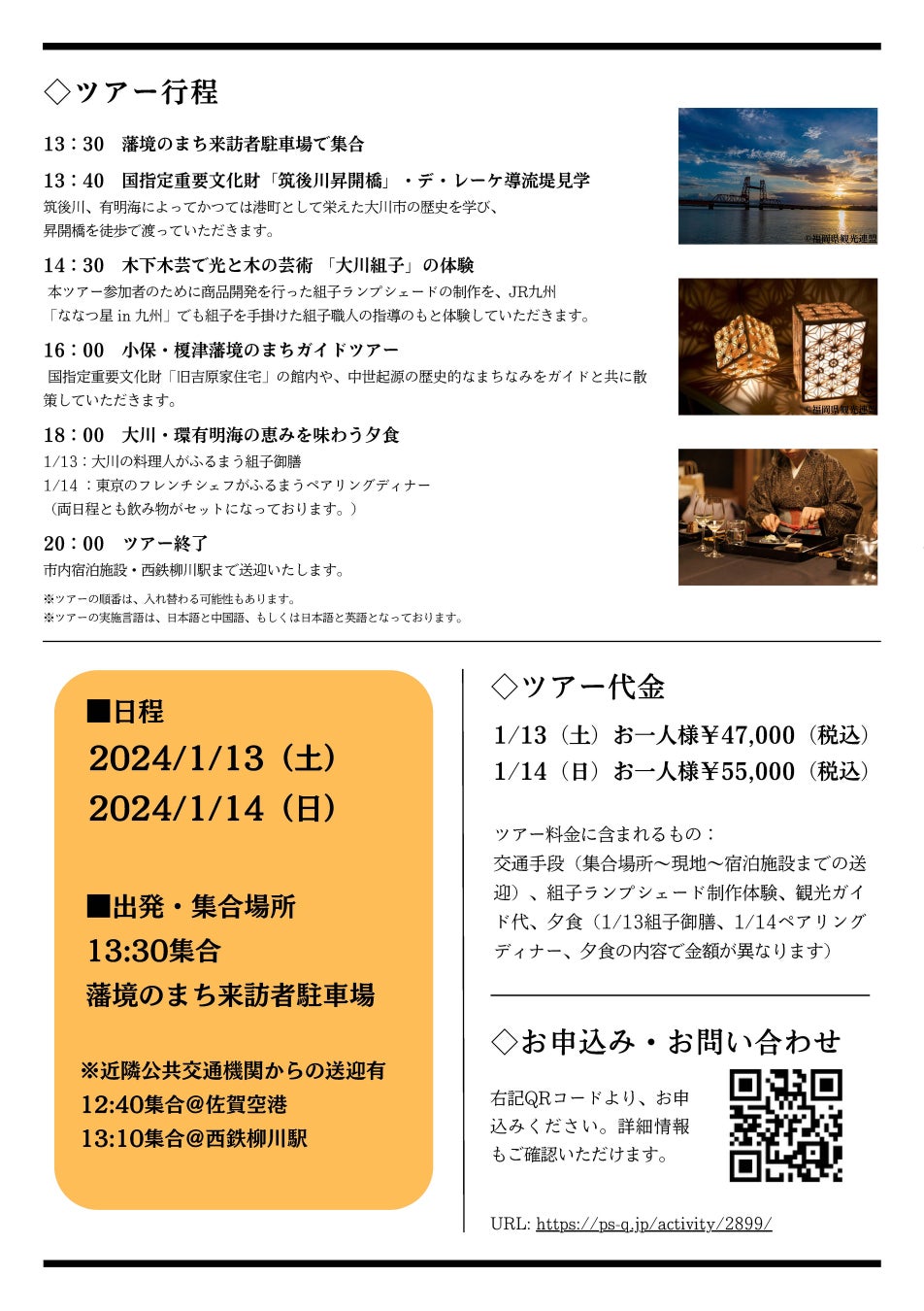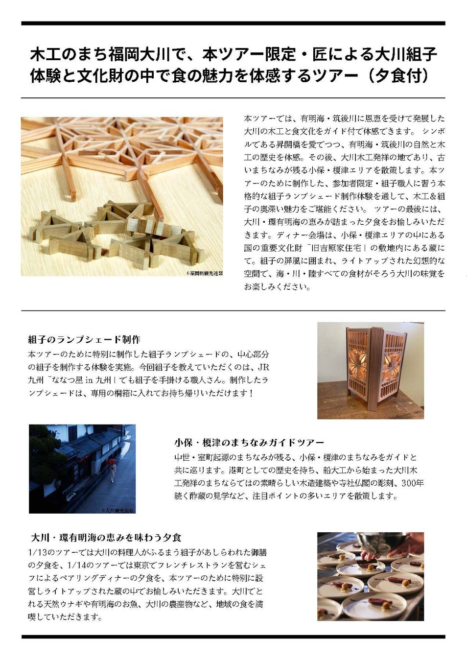 本ツアーは、有明海・筑後川に恩恵を受けて発展した大川の木工と食文化をガイド付で体感できるツアーとなっております。筑後川昇開橋や小保・榎津の町並みをガイドと巡り、大川の歴史や文化を学べるだけでなく、本ツアーのために商品開発を行った組子ランプシェードの制作を、JR九州「ななつ星 in 九州」でも組子を手掛けた組子職人の指導のもと体験していただきます。本ツアーの夕食は国指定重要文化財「旧吉原家住宅」の蔵にて、1/13のツアーでは、明治9年創業の大川の料亭「三川屋」による組子御膳の夕食を、1/14のツアーでは、東京・麻布十番「エルブランシュ」オーナーシェフ 小川智寛氏によるペアリングディナーの夕食をお愉しみいただけます。