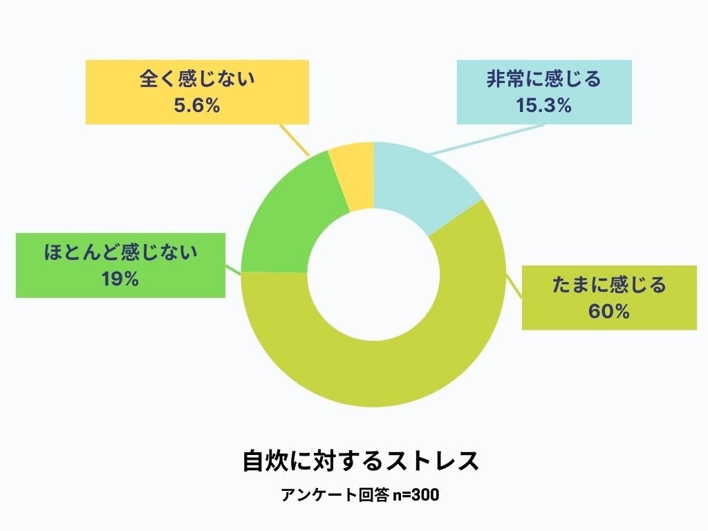 「たまに感じる」と答えた人が最多で、自炊の準備、計画、後片付けが原因で時折ストレスを感じることが多い一方で、「非常に感じる」と「ほとんど感じない」または「全く感じない」と答えた人もおり、これは調理スキルや時間管理能力、自炊に対する意識によって異なります。