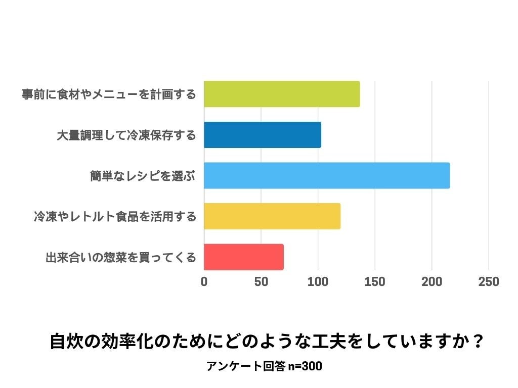 次いで、「事前に食材やメニューを計画する」が計画性と効率の両方を提供し、「冷凍やレトルト食品を活用する」と「大量調理して冷凍保存する」は忙しい時でも素早く食事を準備できる利便性を重視しています。