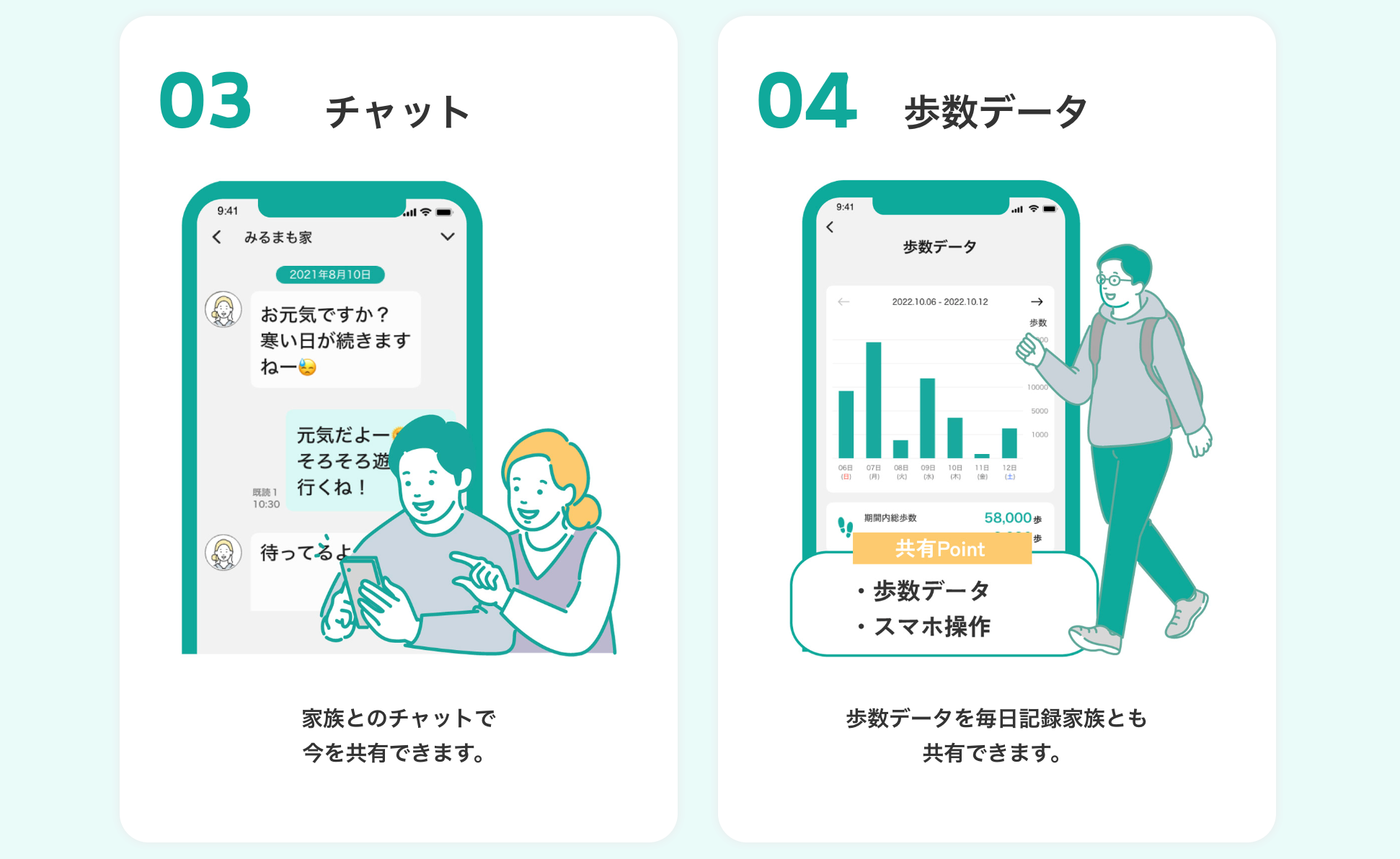 歩数やスマホ操作など日々の記録や写真共有で、“離れていても安心”できるコミュニケーション