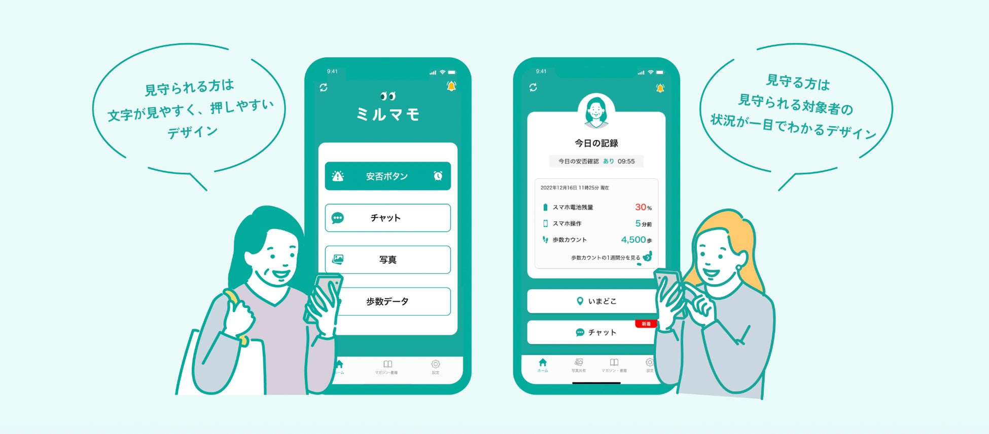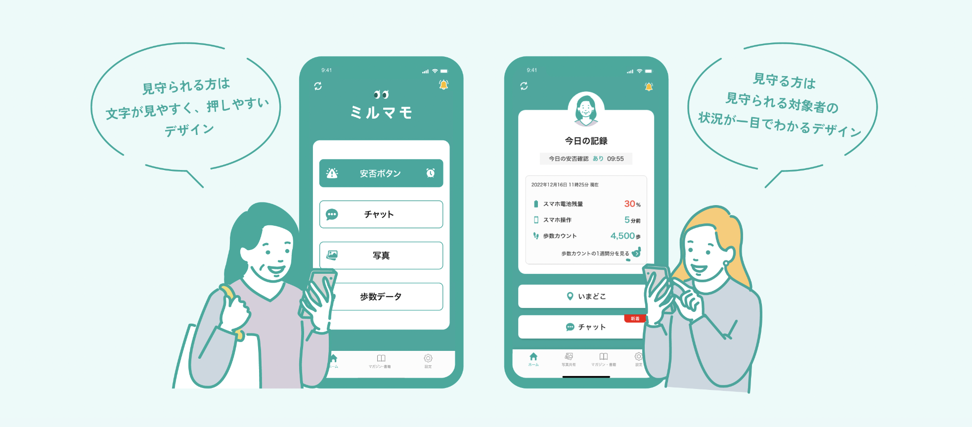 「ミルマモ」は、離れて暮らすご家族の安否状況や位置情報を一目で確認できるほか、歩数データやスマホ操作時間など日々の記録を知ることができます。さりげないコミュニケーションのきっかけを作る写真共有やチャット機能で、双方にとって“離れていても安心”できるツールとして毎日の暮らしに寄り添います。