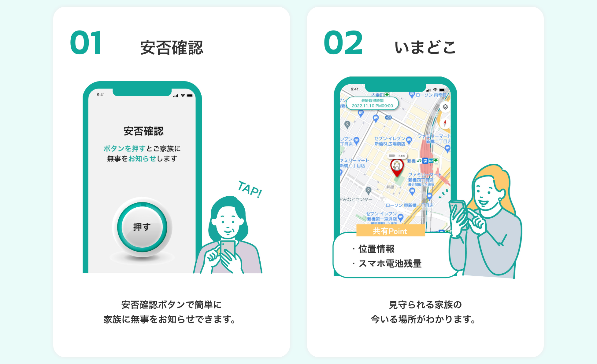 見守られるご家族の今いる場所がわかります。スマホの電池残量も表示します。
