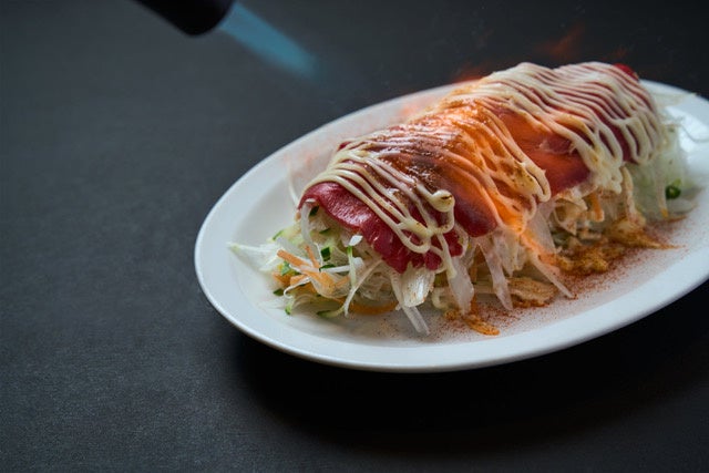 ”シンシンのバーナー焼き”は、稀少部位シンシンをサラダの上に敷き詰めて、仕上げにお客様の前でバーナーを使い炙り、おろしポン酢をかけて完成。SNS映えする見た目も味も極上のメニューです。