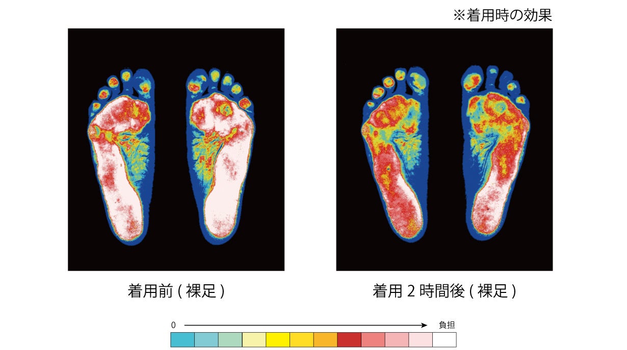 着用前は足全体、特に土踏まず部分に体重がかかっていたが、KEEPFITインソール着用2時間後、土踏まず部分の圧力が減り、足本来の自然なに形に整えられています。