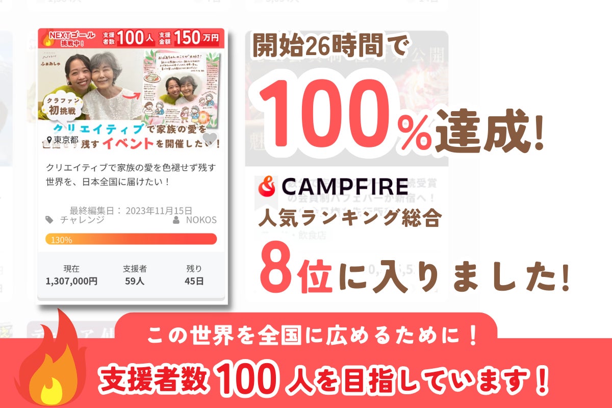 法人設立の10日後にクラウドファンディングをリリースし、2日で目標金額を達成。CAMPFIRE総合人気ランキングTOP8に入りました。