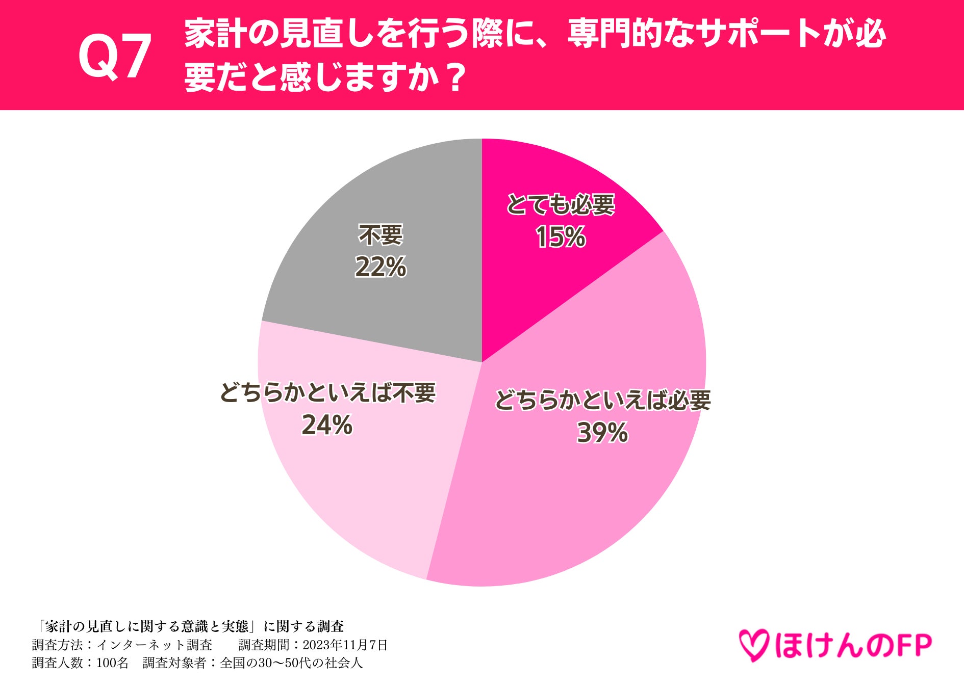 最後に、家計の見直しを行う際に、専門的なサポートが必要だと感じるか伺ったところ、「どちらかといえば必要(39.0%)」「とても必要(15.0%)」という結果となり、半数以上の方は必要と感じていることがわかりました。