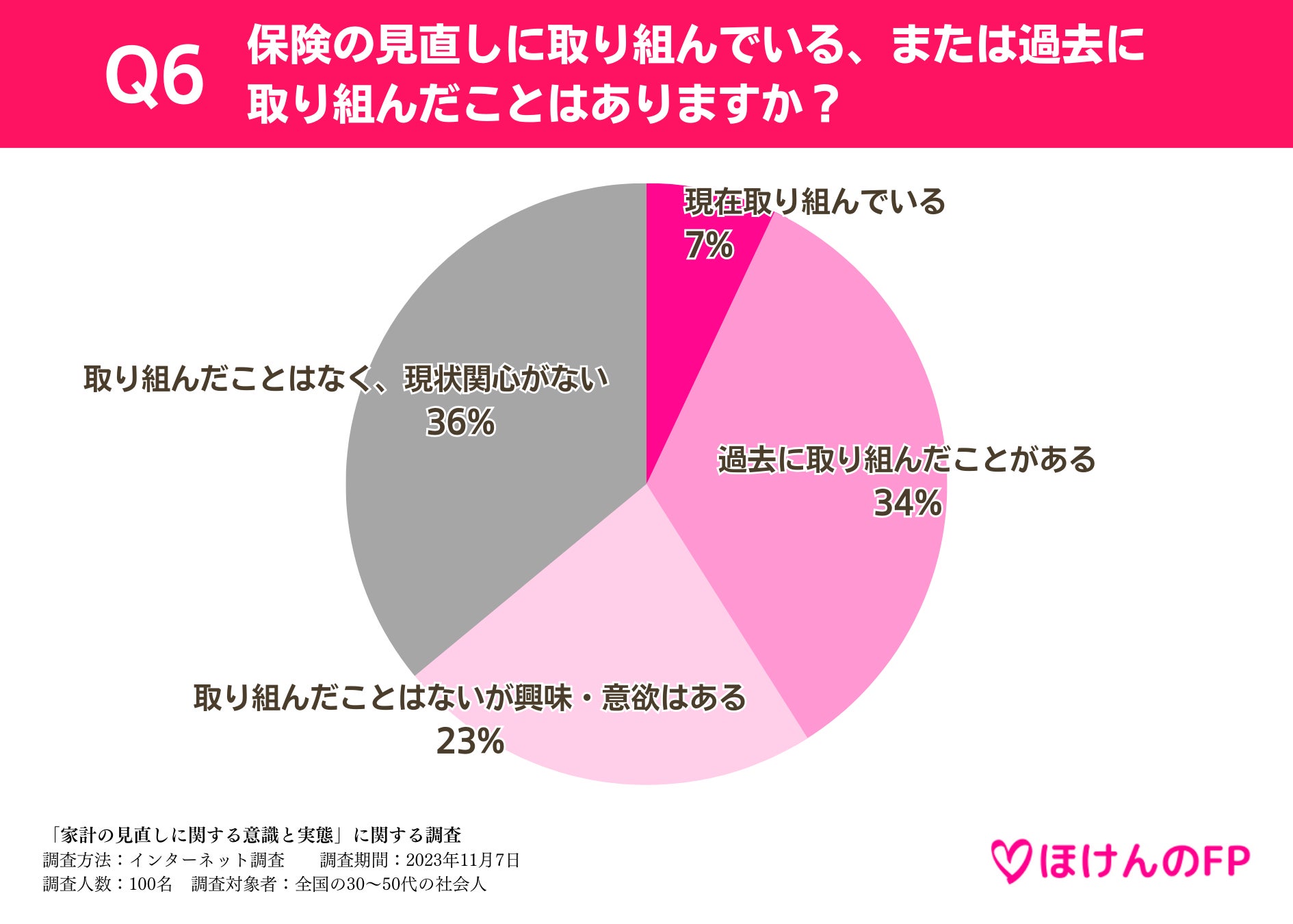 続いて、保険の見直しに取り組んでいる、または過去に取り組んだことがあるか伺ったところ、「取り組んだことはなく、現状関心がない(36.0%)」と回答した方が最も多い結果となりました。