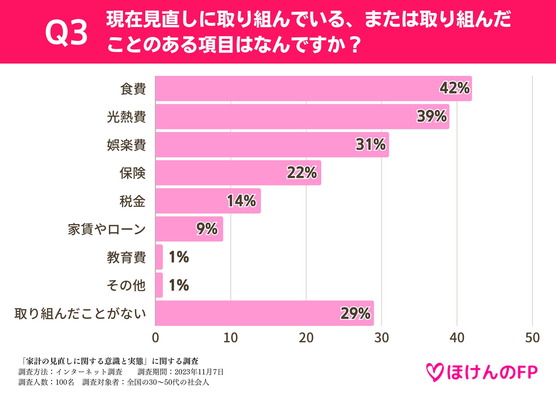 そこで、現在見直しに取り組んでいる、または取り組んだことのある項目について伺ったところ、「食費(42.0%)」「光熱費(39.0%)」「娯楽費(31.0%)」という結果となりました。