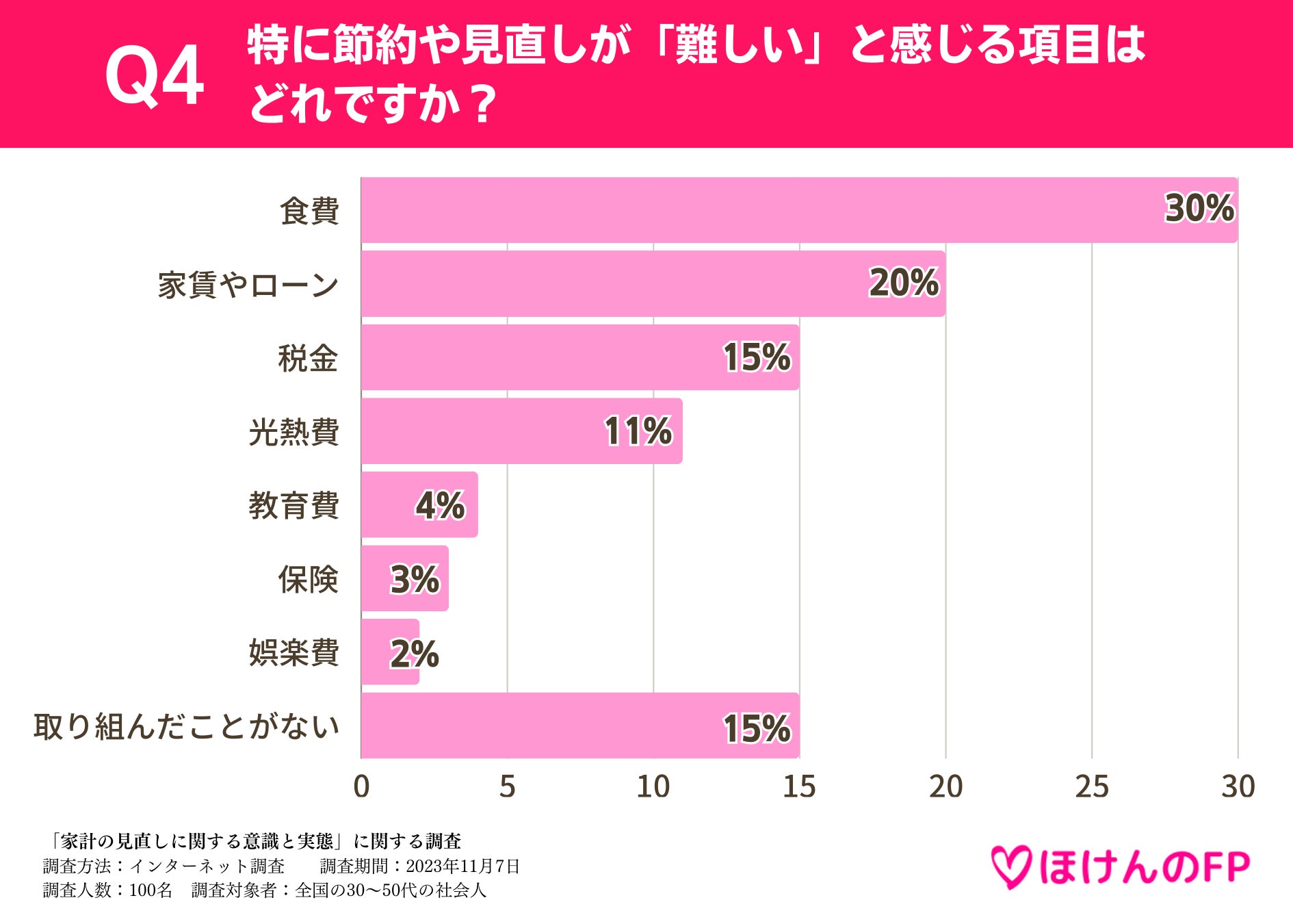 特に節約や見直しが難しいと感じる項目について伺ったところ、「食費(30.0%)」が最も多い結果となりました。