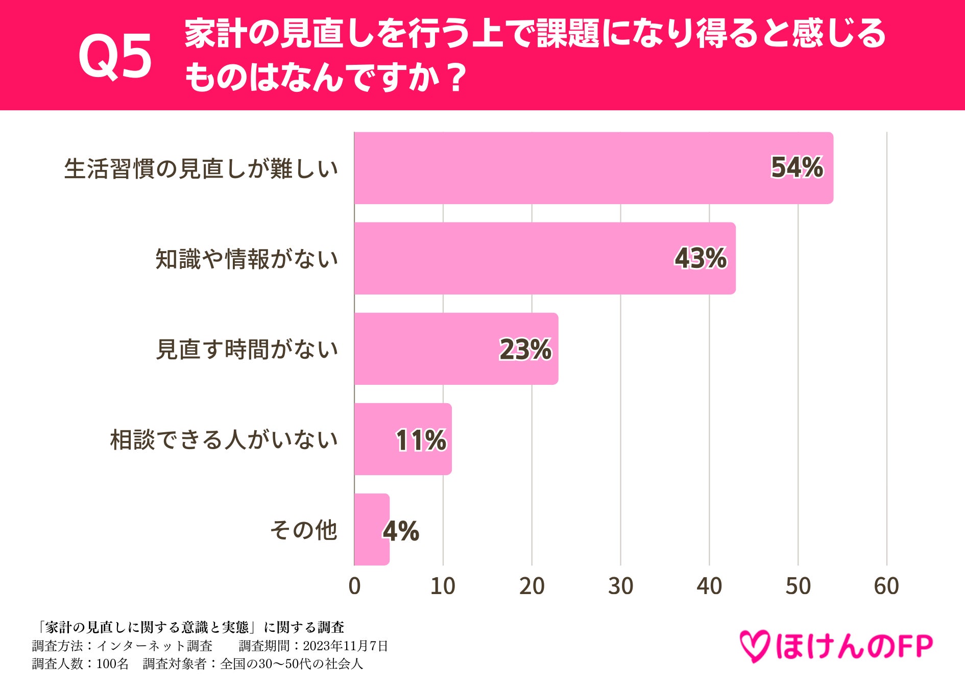 次に、家計の見直しを行う上で課題になりえると感じるものについて伺ったところ、「生活習慣の見直しが難しい(54.0%)」「知識や情報がない(43.0%)」といった回答が集まりました。