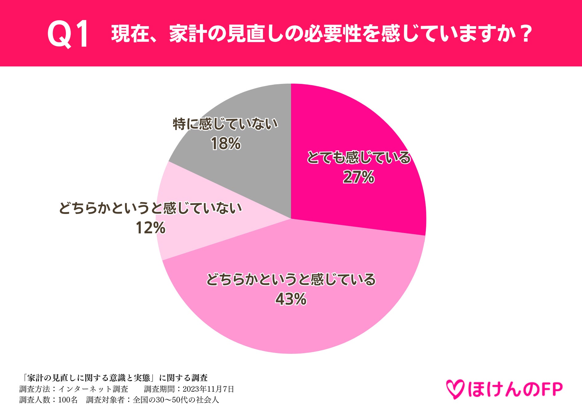 はじめに、現在、家計の見直しの必要性を感じているか伺ったところ、「どちらかというと感じている(43.0%)」「とても感じている(27.0%)」という回答が集まり、7割の方は見直しの必要性を感じていることがわかりました。