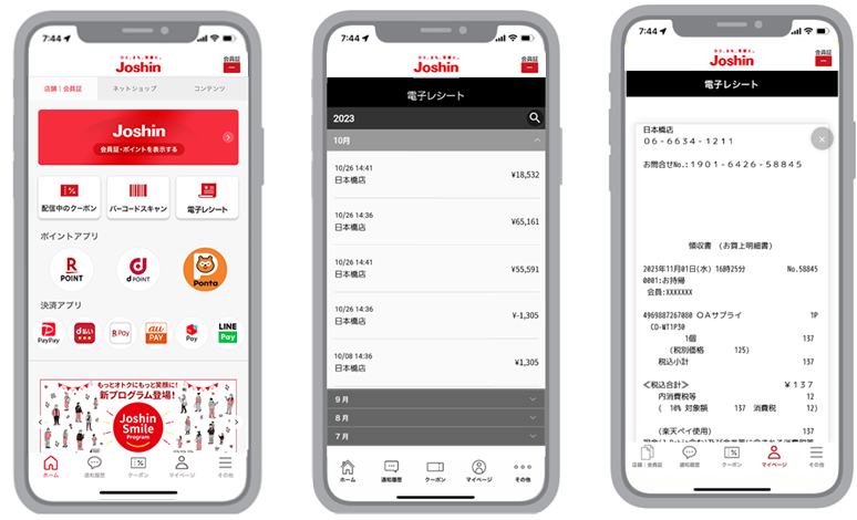 紙レシート発行の抑制など、キャッシュレス社会や環境負荷に配慮した店舗運営に貢献することはもとより、上新電機がお客様に提供するアプリ「ジョーシンアプリ」を通じて、お客様自身のスマートフォンで電子レシートを受取り、購買履歴の閲覧や商品保証の購入証明として活用いただける環境を提供してまいります。