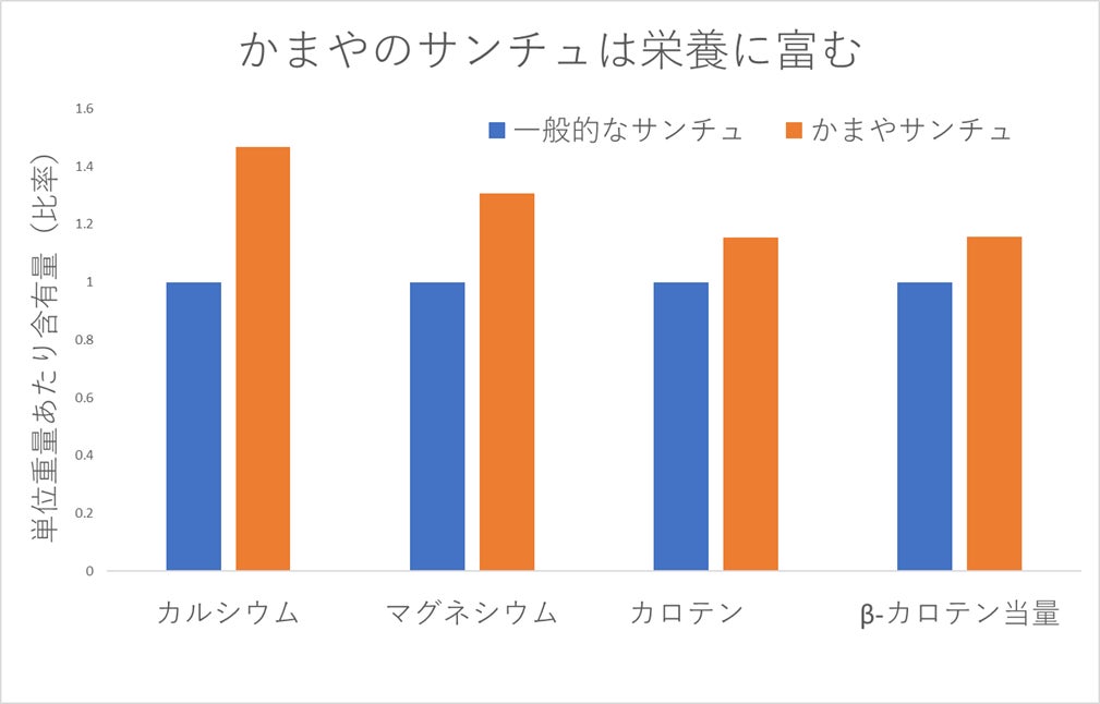 かまやのサンチュはミネラルやビタミンの含有量が多くなっています。成分分析の結果、一般的なサンチュに比べ、カルシウム1.5倍、マグネシウム1.3倍、カロテン1.1倍と栄養に富んでいることが判明しています。