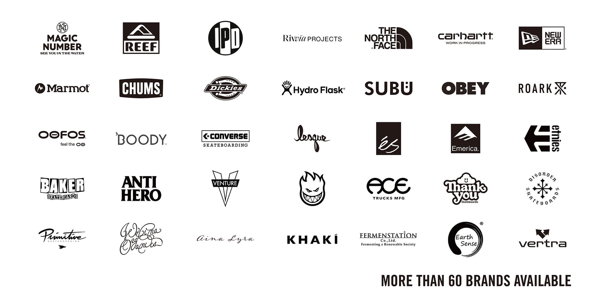設立15周年を迎えたオリジナルブランド“MAGIC NUMBER”(マジックナンバー)、カリフォルニアからは”REEF”(リーフ)、”IPD”(アイピーディー)、“Rivvia PROJECTS”(リビアプロジェクツ)といった国内総代理店契約を結ぶブランドはもちろんのこと、大小問わず長年の関係で培った世界中のブランドをラインナップ。