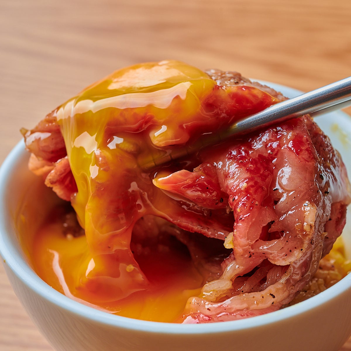 ~黒毛和牛のリブロースをさっと炙って頂き、卵黄ダレにつけてお召し上がりください。~