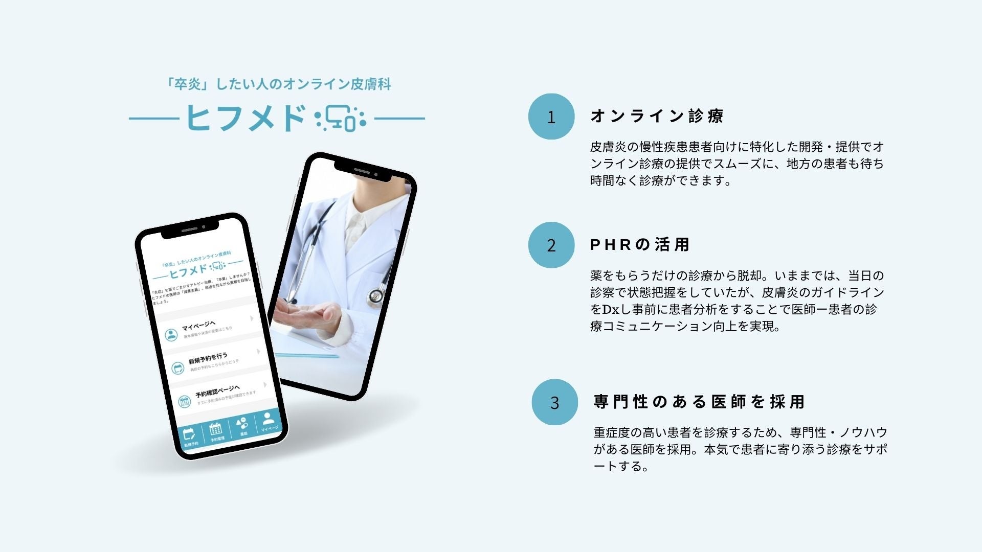 当社は「医療の見える化をし、個別化医療を実現する」をミッションに掲げ、2023年3月より卒炎患者を増やすアトピー性皮膚炎専門の患者向けアプリ、ヒフメドを提供しております。ヒフメドは、患者自身が症状を記録し、データを分析することで、医師と共に最適な治療法を見つけ出す新しいアプローチを提供します。さらに、オンライン診療の導入により、医療アクセスと待ち時間の短縮、患者のストレス軽減などに大きな成果を上げています。