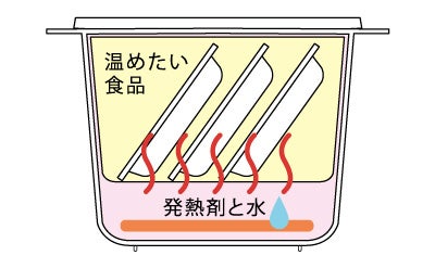 発熱剤に水を注ぐと発生する高温の水蒸気で、ボックス内の食品を短時間で温めます。わざわざ湯煎のための湯を沸かす手間もなく火災の危険もありません。