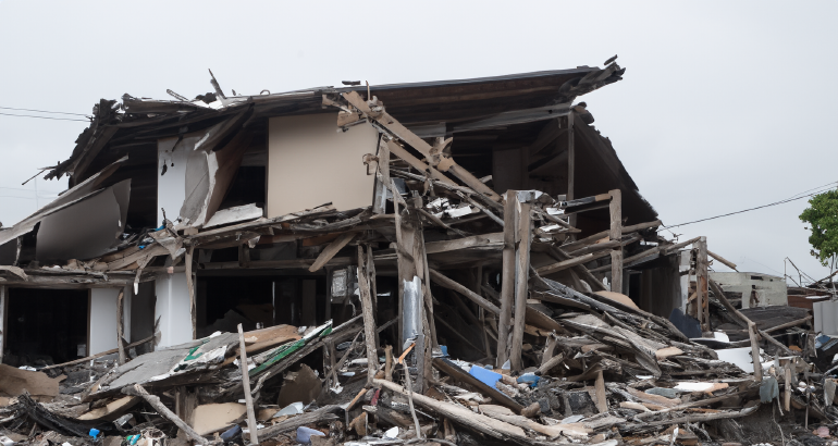 雨水による雨漏りが腐食を進行させ、家が弱ったところで台風や地震を受けて損壊するという構図です。