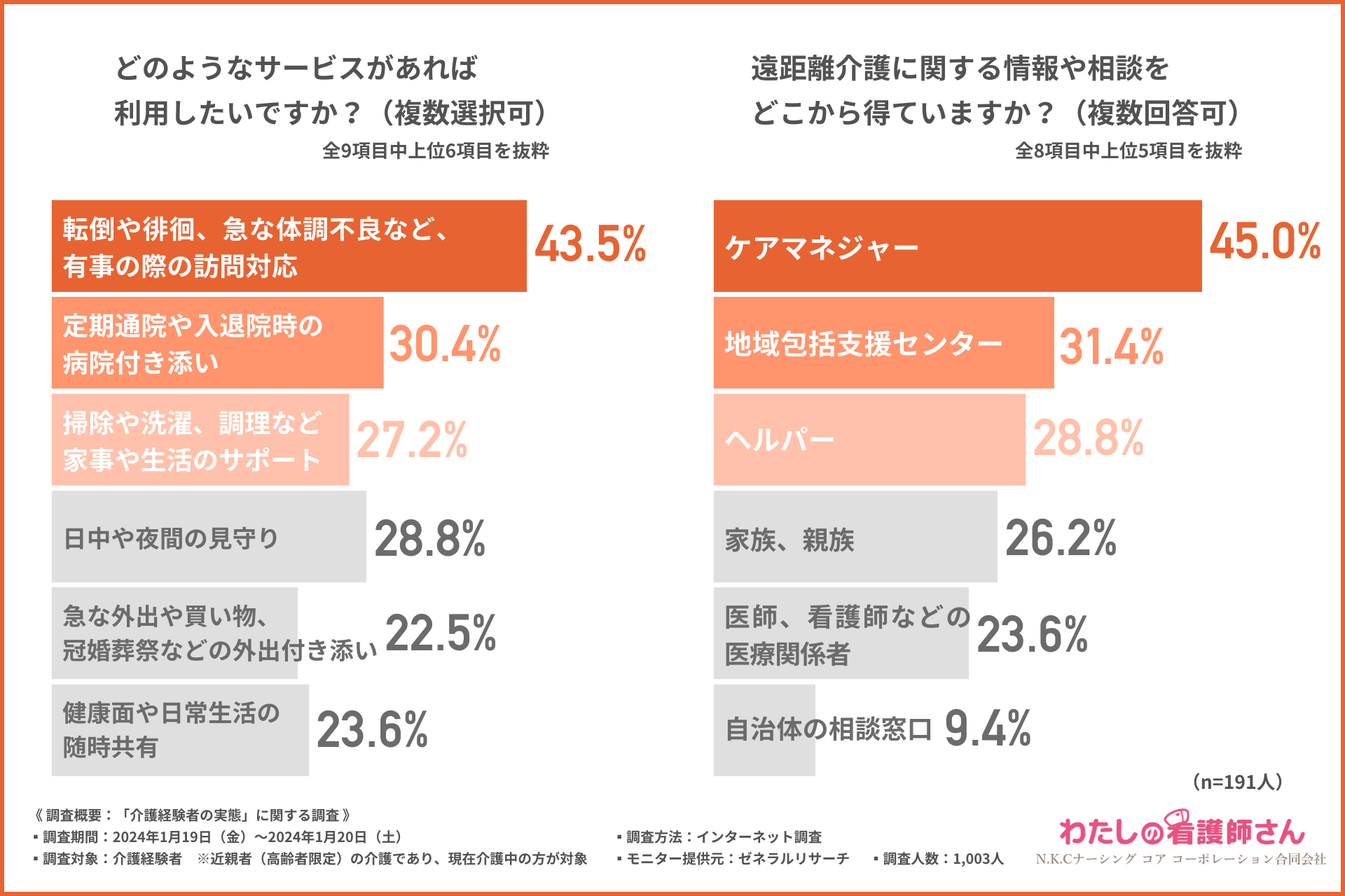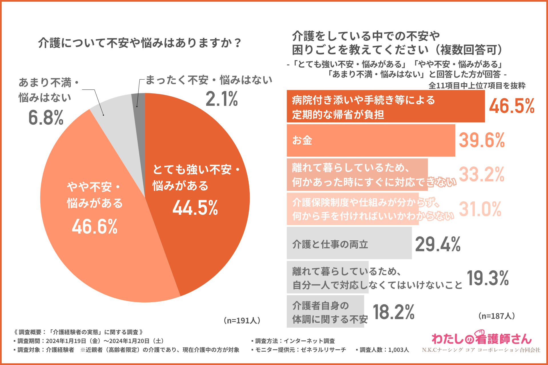 介護保険外自費サービス「わたしの看護師さん」(https://my-nurse.jp/)を運営するN.K.Cナーシングコアコーポレーション合同会社は、遠距離介護者を中心に、介護を行う家族の負担や不安感が明らかにするために、介護の経験がある方を対象に、「介護経験者の実態」に関する調査を実施しました。