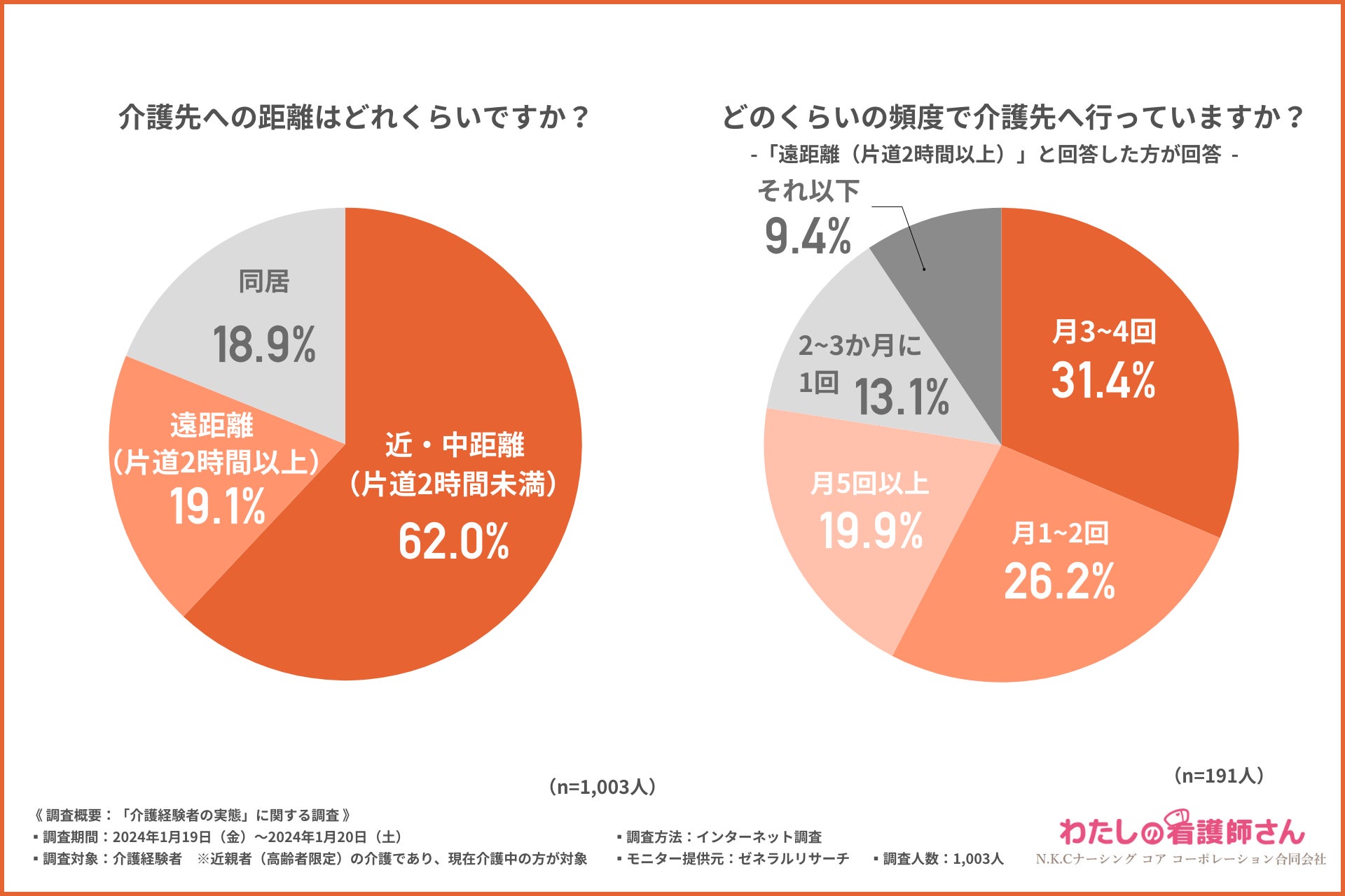 はじめに「介護先への距離はどれくらいですか?」と質問したところ、『近・中距離(片道2時間未満)(62.0%)』と回答した方が最も多く、次いで『遠距離(片道2時間以上)(19.1%)』と続きました。