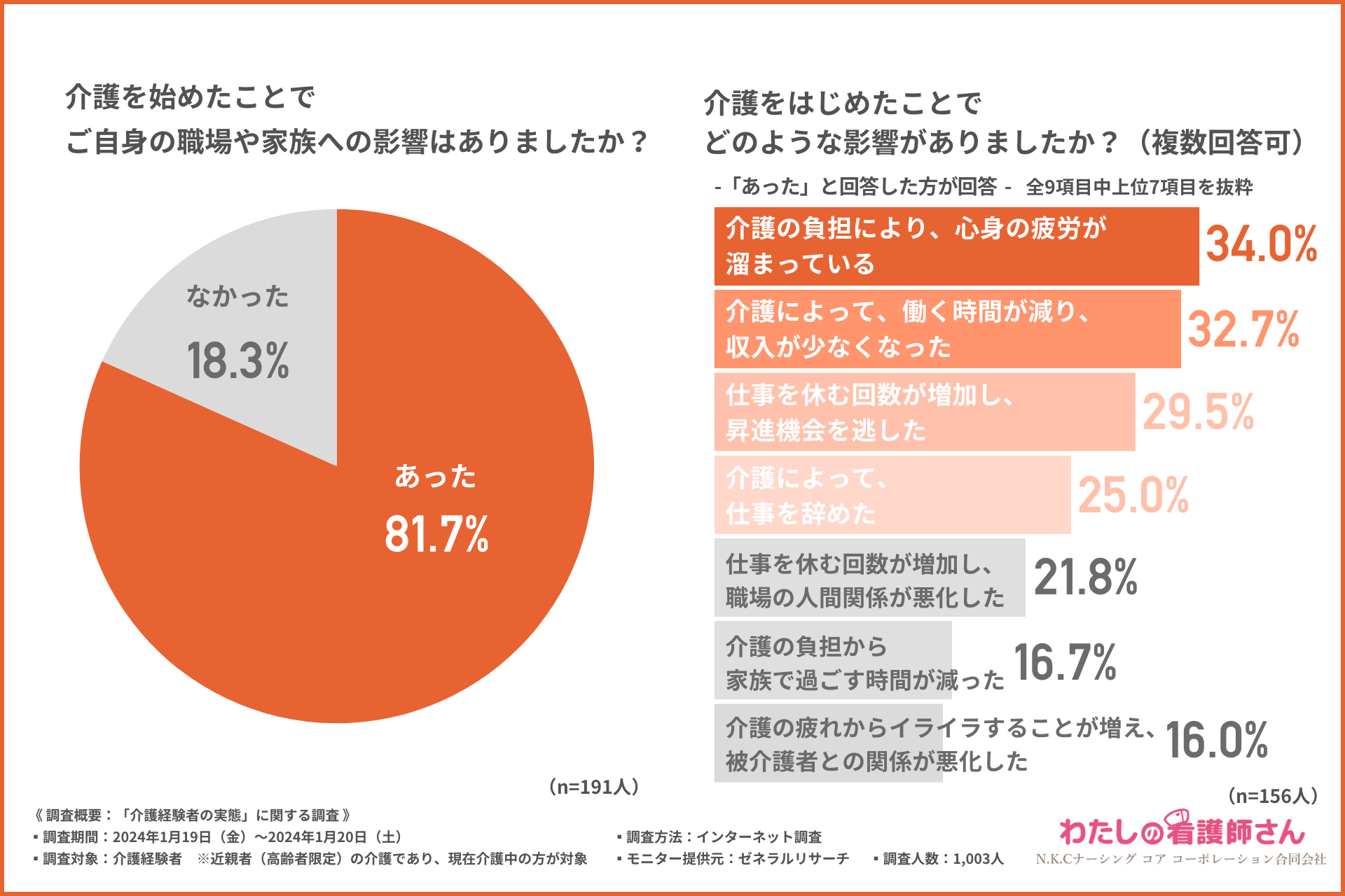 「介護を始めたことでご自身の職場や家族への影響はありましたか?」と質問したところ、約8割の方が『あった(81.7%)』と回答しました。