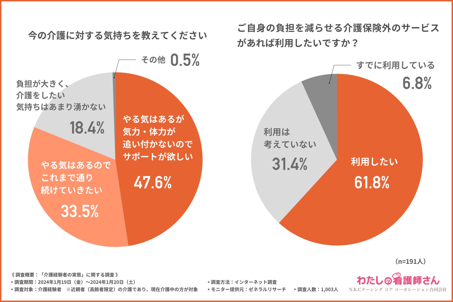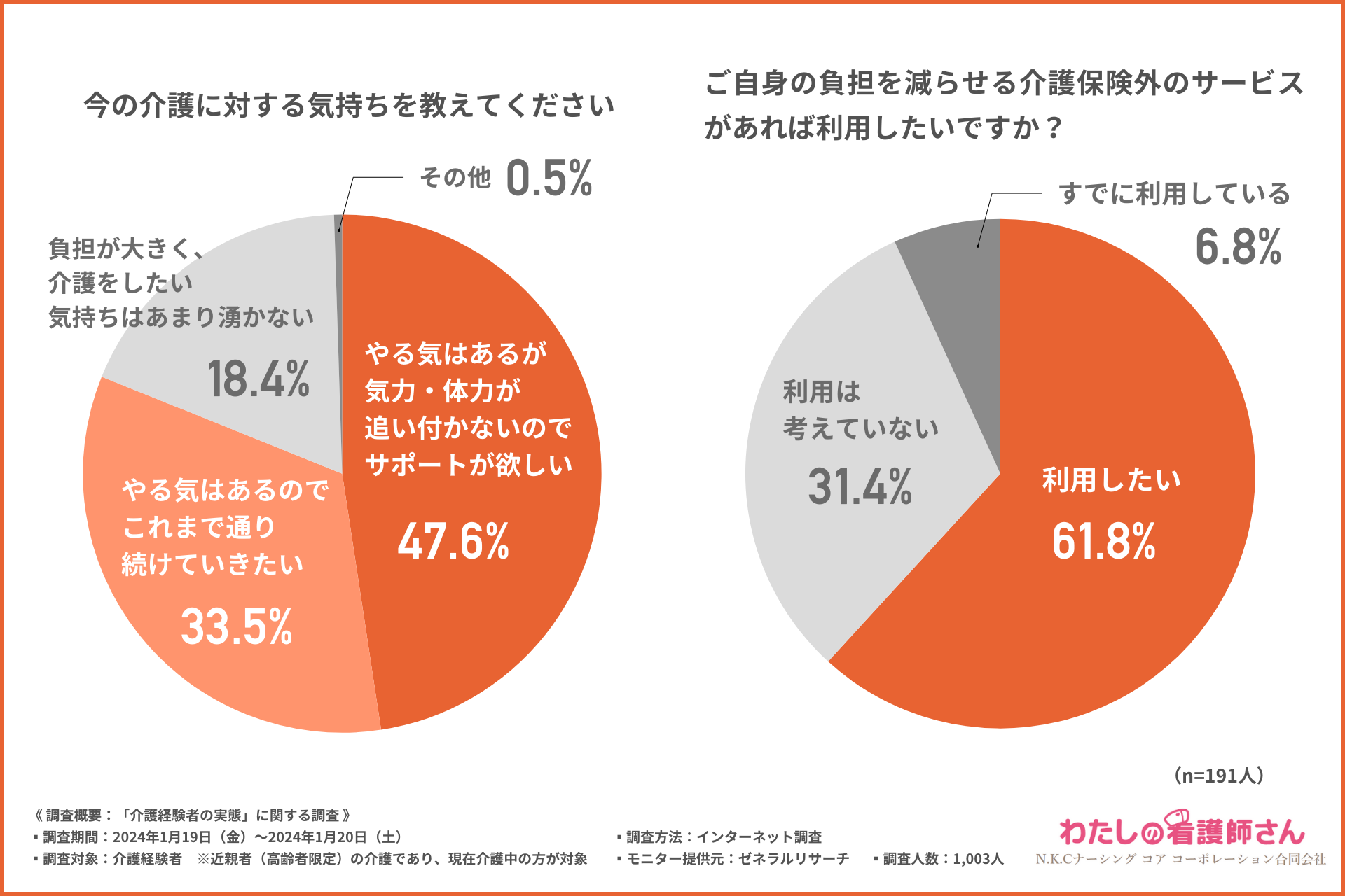 そこで「今の介護に対する気持ちを教えてください」と質問したところ、『やる気はあるが気力・体力が追い付かないのでサポートが欲しい(47.6%)』『やる気はあるのでこれまで通り続けていきたい(33.5%)』『負担が大きく、介護をしたい気持ちはあまり湧かない(18.4%)』という回答結果になりました。