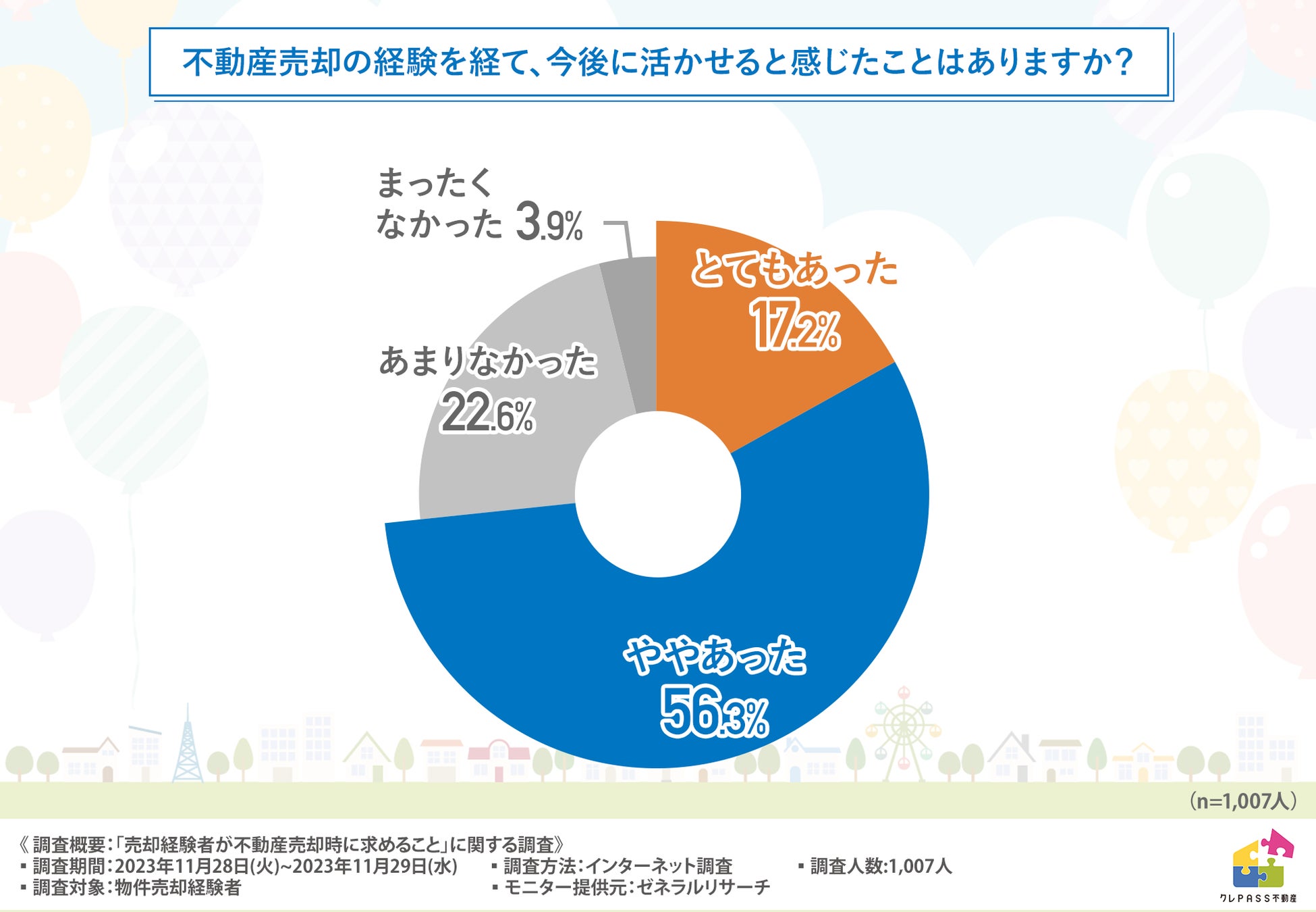 「不動産売却の経験を経て、今後に活かせると感じたことはありますか?」と質問したところ、『とてもあった(17.2%)』『ややあった(56.3%)』という回答結果になりました。
