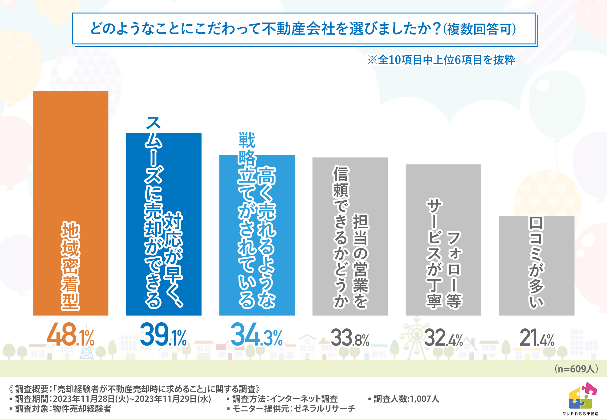 「どのようなことにこだわって不動産会社を選びましたか?(複数回答可)」と質問したところ、『地域密着型(48.1%)』と回答した方が最も多く、次いで『対応が早く、スムーズに売却ができる(39.1%)』『高く売れるような戦略立てがされている(34.3%)』と続きました。