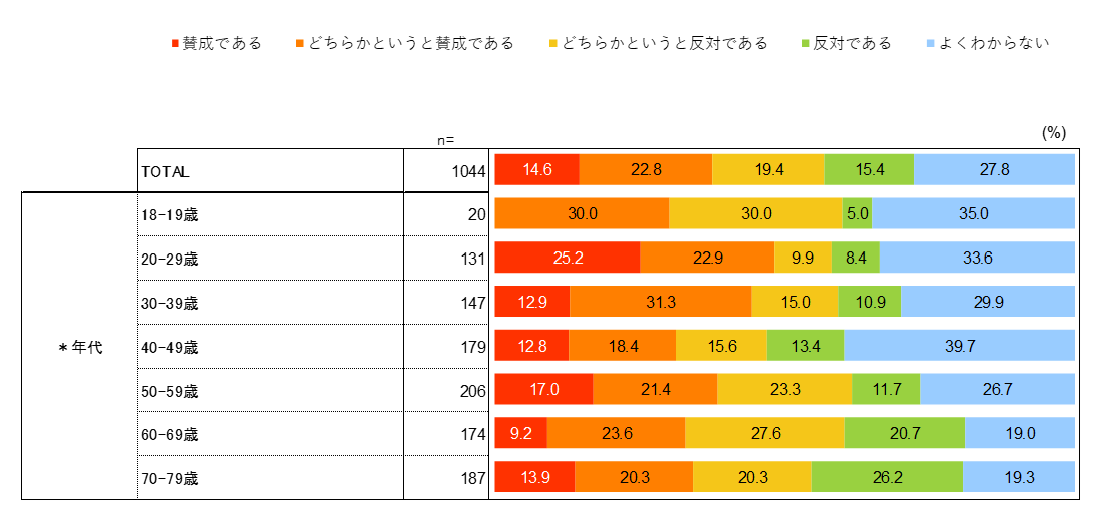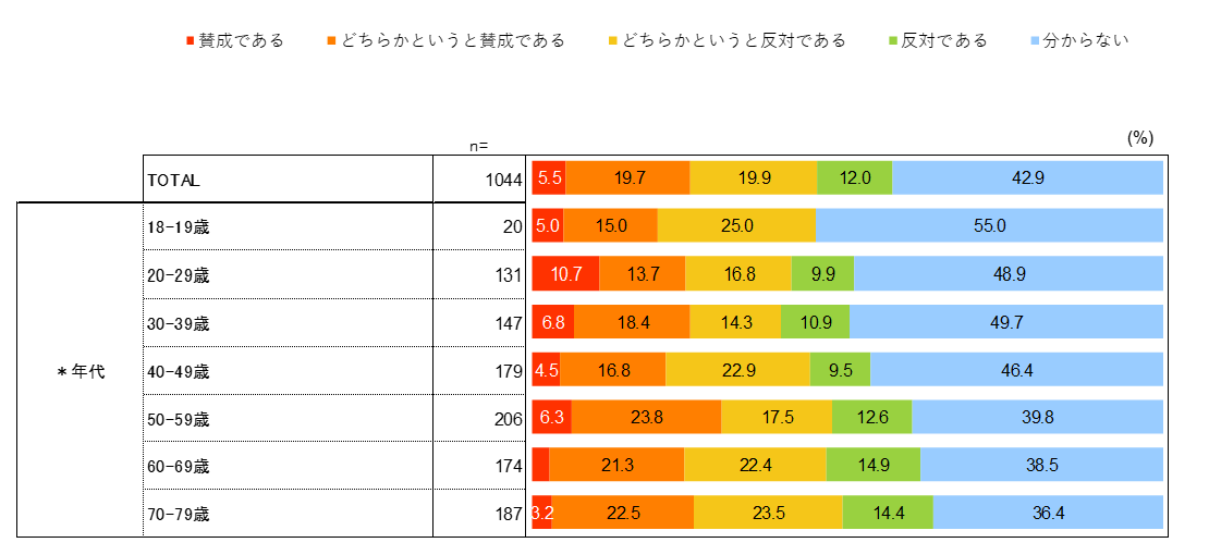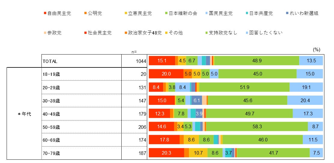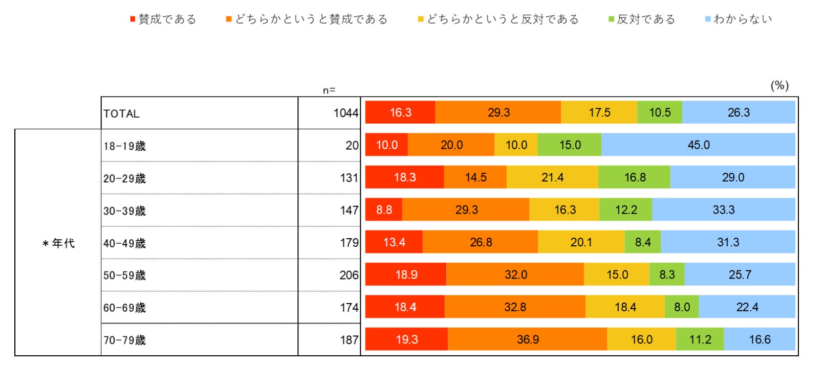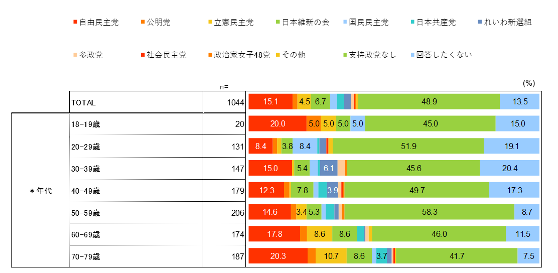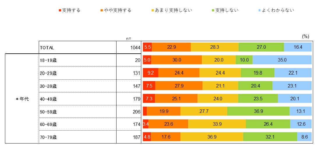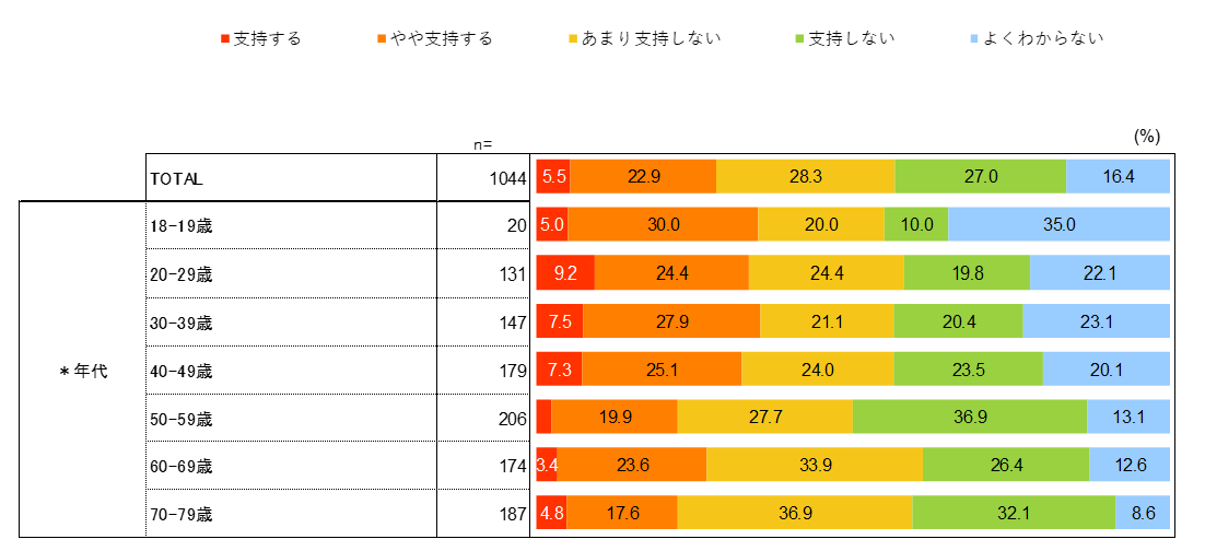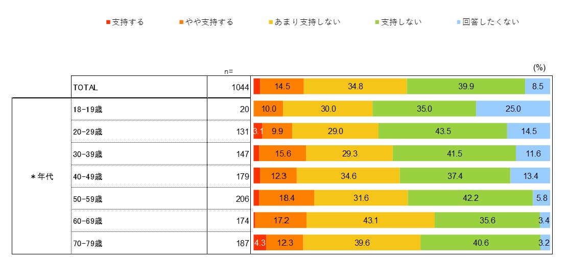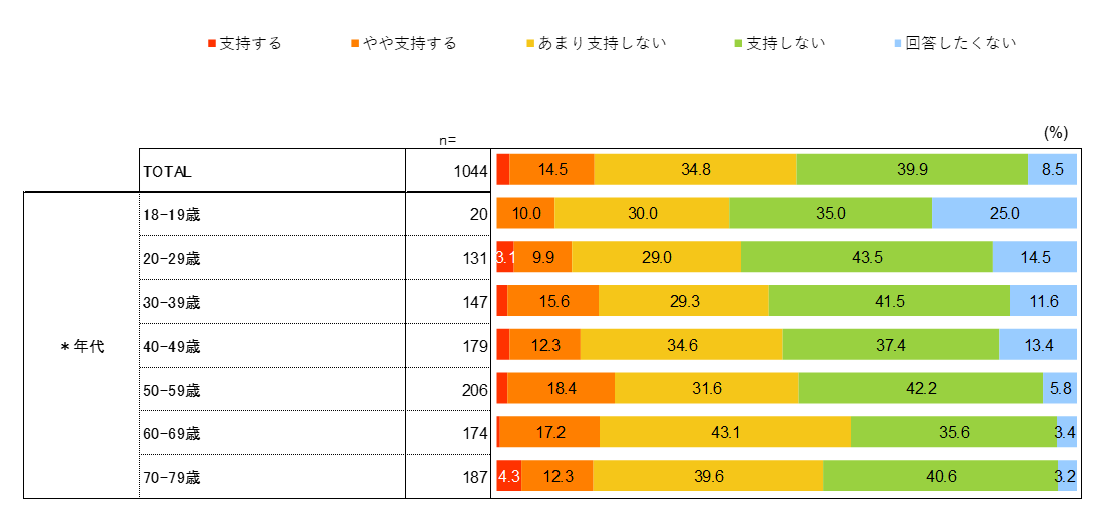 ・年代別データでは、支持者は18歳~40代合計33.8%、50代以上の合計23.8%と所得税減税に関する世代間ギャップが背景にあることが分かりました。