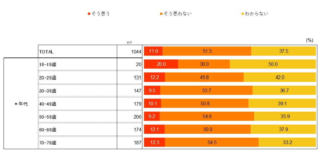 ・「岸田内閣が任期途中で退陣した場合、その原因は減税政策を主張したからだと思いますか?」という設問に対して、「そう思う」が11.0%、「そう思わない」が51.5%、「分からない」が37.5%。岸田政権の支持率下落の主因として、減税政策そのものが理由とは考えられていないことが分かります。