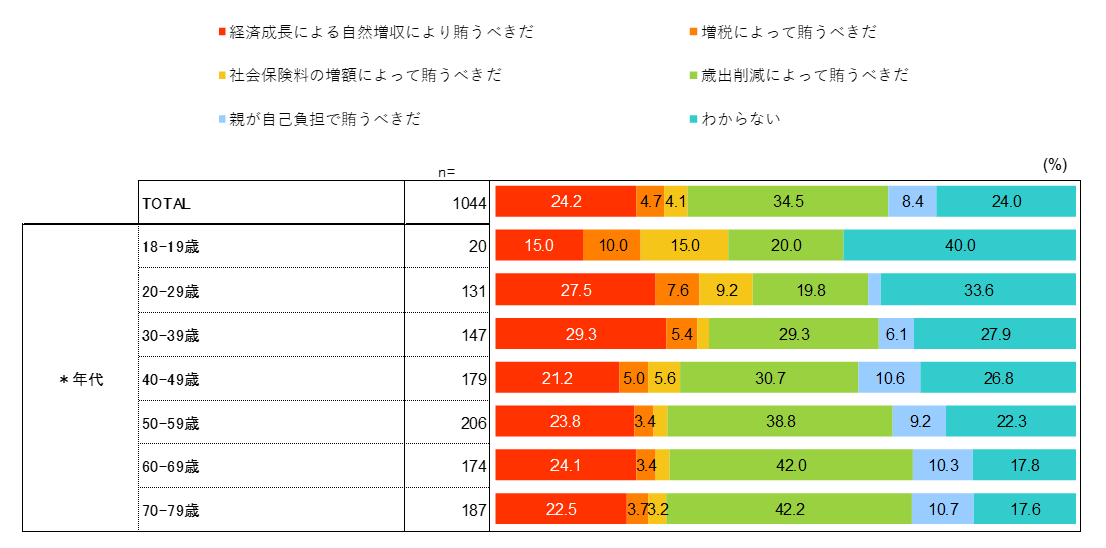 ・少子化対策の財源は「歳出削減によって賄うべきだ」34.5%、「経済成長による自然増収により賄うべきだ」24.2%が多く、「増税によって賄うべきだ」に関しては4.7%の回答者しか容認していません。