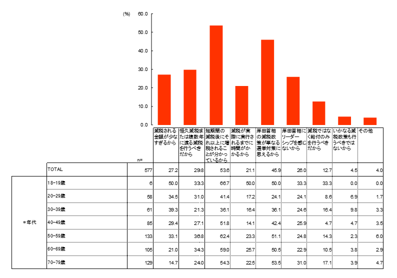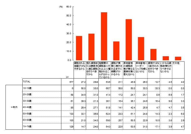 ・不支持理由は1位「短期間の減税後にそれ以上に増税されることがわかっているから」53.6%、2位「岸田首相の減税政策が単なる選挙対策に思えるから」45.9%、3位「恒久減税または複数年に渡る減税を行うべきだから」29.8%であり、岸田首相の一時的なパフォーマンスに過ぎないと有権者が受け止めていることが分かります。