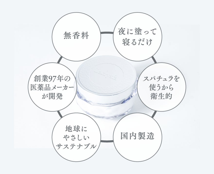 まるでパックをしているような⼼地よさで、リッチな気分を演出するナイトクリーム。朝起きた時のさらもち肌を実感してください。