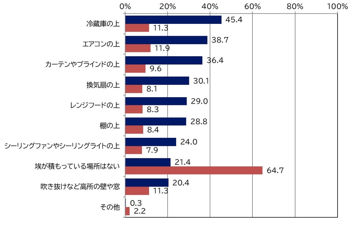 1年以上掃除していなくて埃が積もっている場所があるか尋ねたところ、45.4%の方が「冷蔵庫の上」と回答。続いて「エアコンの上」38.7%、「カーテンやブラインドの上」36.7%、「換気扇の上」「レンジフードの上」が続く結果となった。同じ項目で10年掃除していない場所があるか聞いたところ、「エアコン」11.9%、「冷蔵庫の上」「吹き抜けなどの高所の壁や窓」が各11.3%と10年以上手つかずとなっている場所があることが明らかになった。