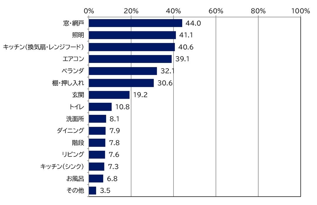 ■普段掃除ができない場所は「窓・網戸」「換気扇・レンジフード」「照明」「エアコン」など