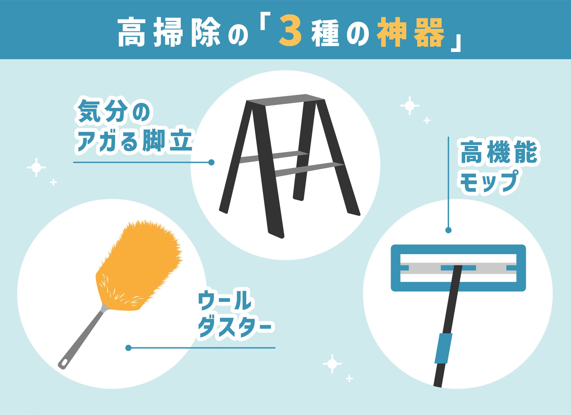 今回は、やりたくない高掃除を、気分の上がる高掃除にさせるテクニックをご提案します。「気分の上がる脚立」・「高機能モップ」・「ウールダスター」を3種の神器として、使いたくなる、掃除がしたくなる、使っていてワクワクする、気分が上がるお掃除アイテムを選ぶことがポイントです。