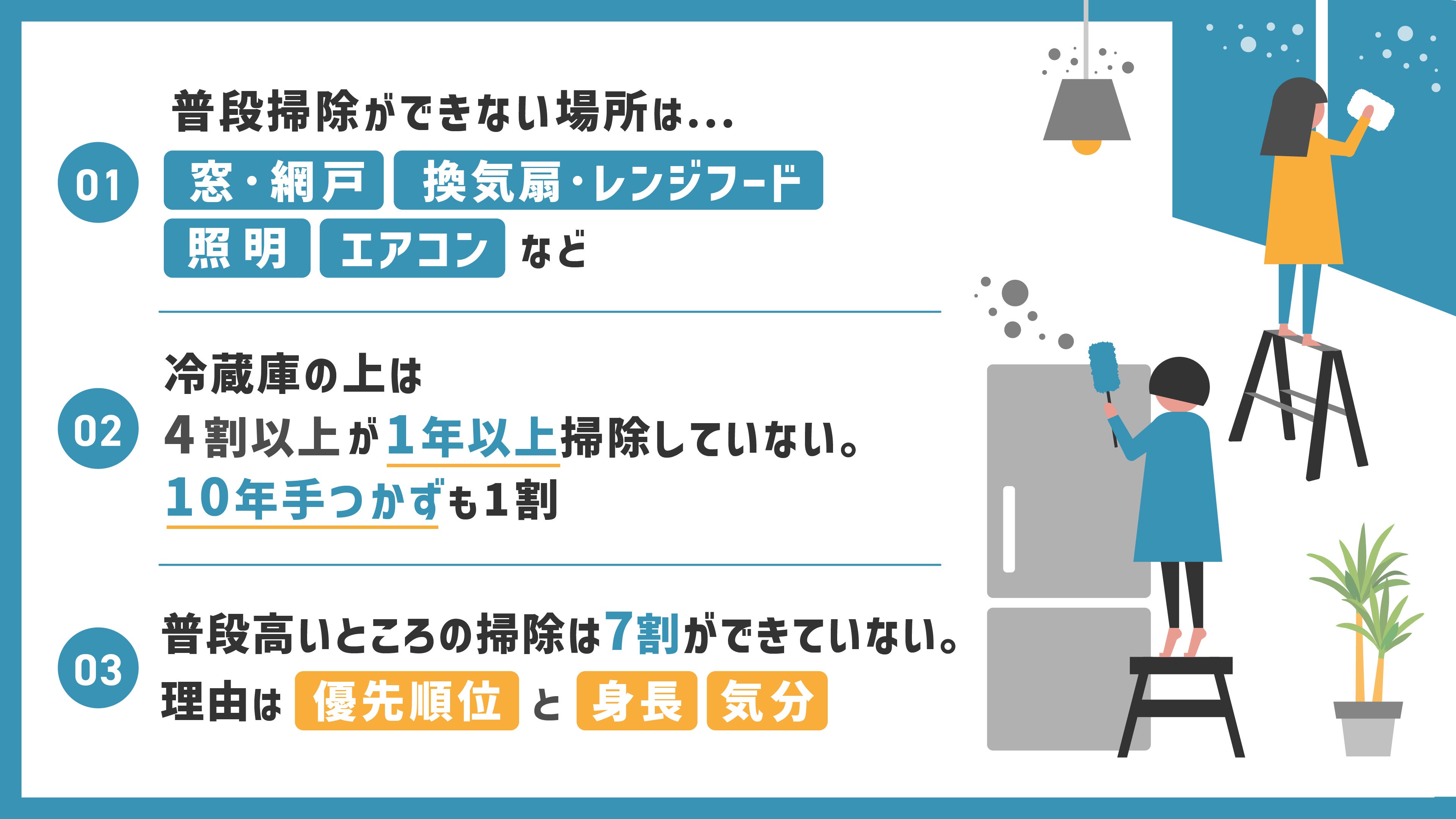 大掃除シーズンに合わせて、「2023大掃除に関する意識調査」を実施!冷蔵庫の上は4割が1年以上掃除せず。10年以上放置が1割理由は「優先順位の低さ」「自身の身長」「気分」